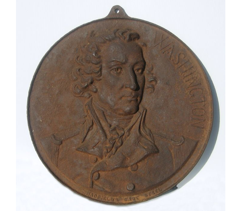 This medallion image of George Washington is both beautiful and unusual, due to its three-quarter profile image of our nation's first president. With his flowing hair, ruffled blouse, and military garb, it survives as the single best casting of its kind that I have ever encountered.