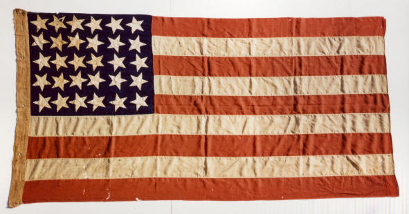 | Period 30 star American National Flag, made from wool bunting with cotton muslin stars. The flag is entirely hand-sewn and there is an unusually wide sleeve of very coarse brown linen or burlap, with 5 whip-stitched grommets.