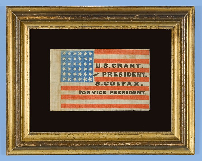 36 star American national parade flag, printed on coarse, glazed cotton. Overprinted in the second through the fifth stripes is black, overprinted text that advertises the 1868 presidential campaign of one of America's most beloved figures, General Ulysses S. Grant, with running mate Schuyler Colfax. Among known parade flags, those made for political campaigns with text or pictorial advertising are the most valuable. Within this group, the flags made for the most memorable historical figures, such as Lincoln and Grant, are highly sought after by collectors.