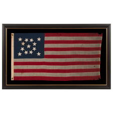 13 STAR ANTIQUE AMERICAN FLAG WITH A MEDALLION CONFIGURATION OF HAND-SEWN STARS AND A BEAUTIFUL, ELONGATED PROFILE, MADE IN THE ERA OF THE 1876 CENTENNIAL OF AMERICAN INDEPENDENCE, IN AN UNCOMMONLY SMALL SIZE AMONG ITS COUNTERPARTS OF THE PERIOD WITH SEWN CONSTRUCTION