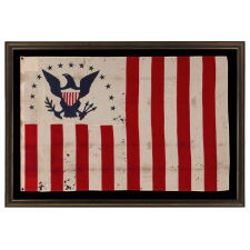 ONE OF THE TWO EARLIEST KNOWN EXAMPLES OF THE FLAG OF THE REVENUE MARINE (a.k.a., REVENUE CUTTER SERVICE), WITH A HAND-PAINTED EAGLE, AN ARCH OF 13 BLUE-PAINTED STARS, HAVING GREAT FOLK QUALITIES, AND 13 VERTICAL STRIPES, LATE 1830’s-1860
