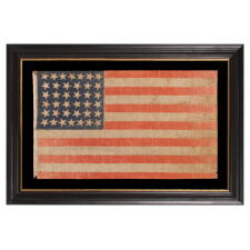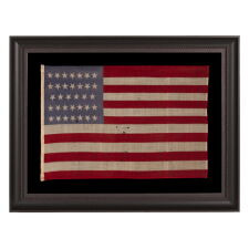 ENTIRELY HAND-SEWN, 38 STAR, ANTIQUE AMERICAN FLAG OF THE INDIAN WARS PERIOD, WITH A SQUARISH PROFILE AND A CANTON THAT IS TALLER THAN IT IS WIDE, SIMILAR TO U.S. INFANTRY AND ARTILLERY BATTLE FLAGS, AND WITH AN ESPECIALLY GRAPHIC PRESENTATIONOF STARS; MADE IN THE ERA WHEN COLORADO WAS THE MOST RECENT STATE TO JOIN THE UNION, 1876-1889