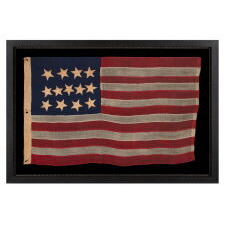 13 STAR ANTIQUE AMERICAN FLAG OF THE CIVIL WAR PERIOD (1861-1865), HOMEMADE AND ENTIRELY HAND-SEWN, WITH ITS CANTON RESTING ON THE WAR STRIPE, AND WITH 9 STRIPES TO REFLECT THE OMISSION OF NORTH & SOUTH CAROLINA, GEORGIA, AND VIRGINIA, THE 4 SLAVE STATES AMONG THE ORIGINAL 13 COLONIES THAT SECEDED FROM THE UNION
