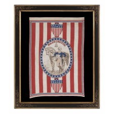 ANTIQUE AMERICAN PARADE FLAG / BANNER WITH A STANDING PORTRAIT OF GEORGE WASHINGTON & HIS HORSE, “BLUESKIN” SET WITHIN AN OVAL WINDOW, ON A GROUND OF RED & WHITE STRIPES, MADE FOR THE 1876 CENTENNIAL OF AMERICAN INDEPENDENCE