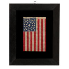 EXTRAORDINARY 34 STAR ANTIQUE AMERICAN FLAG WITH AN ACCORDION OR HOURGLASS MEDALLION CONFIGURATION THAT SURROUNDS A PENTAGON OF STARS IN THE CENTER; MADE OF FINE SILK AND ENTIRELY HAND-SEWN; MADE DURING THE OPENING YEARS OF THE CIVIL WAR (1861-63), IN A TINY SIZE AMONG ITS COUNTERPARTS OF THE PERIOD; REFLECTS THE ADDITION OF KANSAS AS THE 34TH STATE