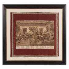 RARE, LARGE SCALE KERCHIEF WITH A BEAUTIFULLY ENGRAVED IMAGE OF JOHN TRUMBULL’S “DECLARATION OF INDEPENDENCE,” LIKELY MADE IN 1826 FOR OUR NATIONS SEMICENTENNIAL (50TH ANNIVERSARY); THE ONLY EXAMPLE I HAVE EVER SEEN OF THIS EXCEPTIONALLY RARE TEXTILE THAT RETAINS ITS ORIGINAL, RED COLORATION
