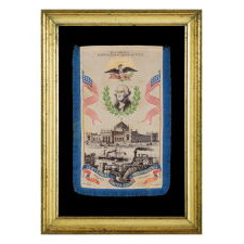EXTRAORDINARY SILK FLAG, COMMISSIONED BY OR PRESENTED TO THE ROCKFORD, ILLINOIS “WIDE AWAKES,” IN SUPPORT OF THE 1860 PRESIDENTIAL CAMPAIGN OF ABRAHAM LINCOLN & HANNIBAL HAMLIN, POSSIBLY CARRIED AT THE OPENING OF THE CIVIL WAR BY COMPANY D OF THE 11TH ILLINOIS INFANTRY