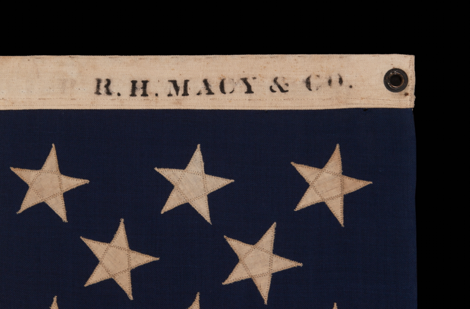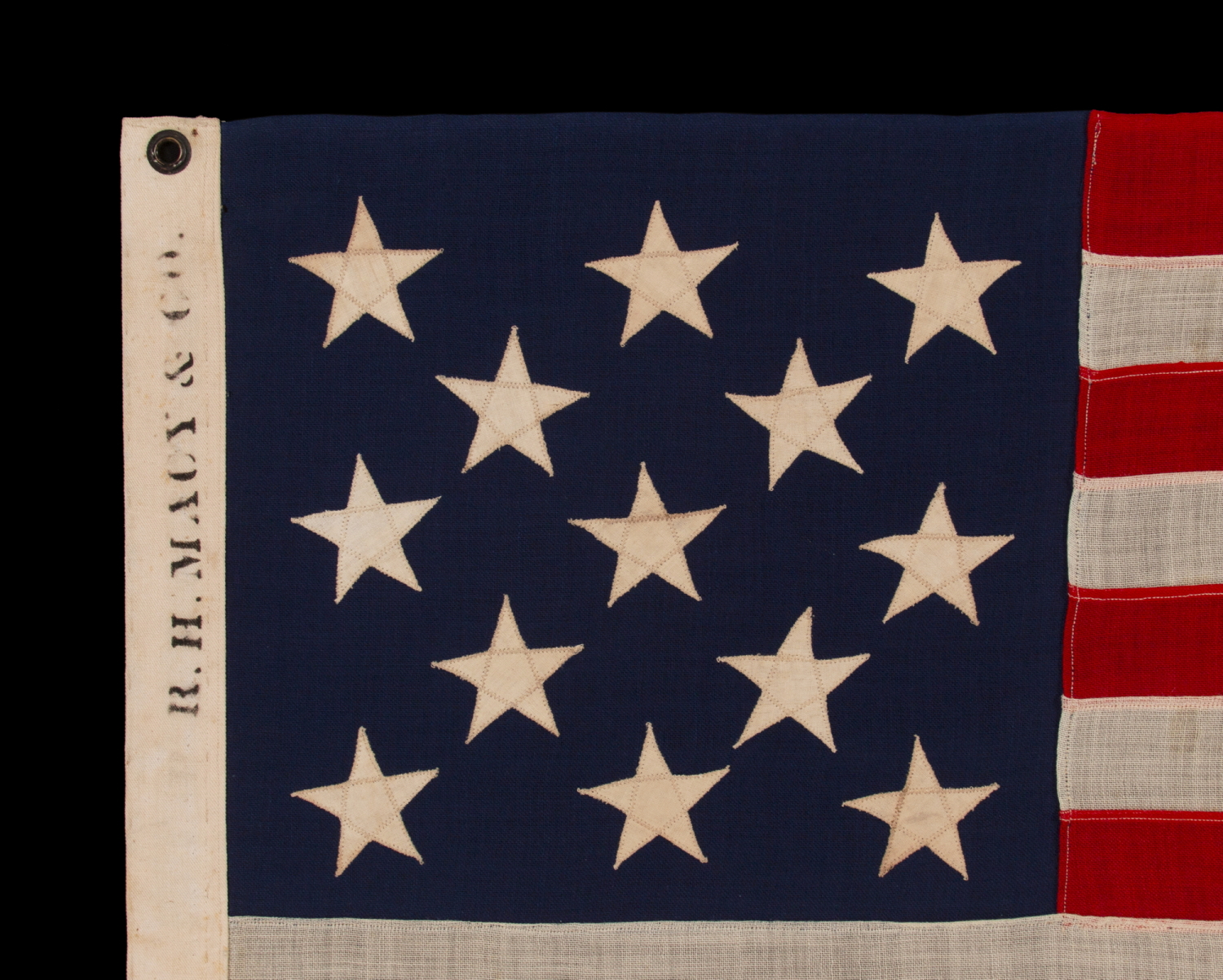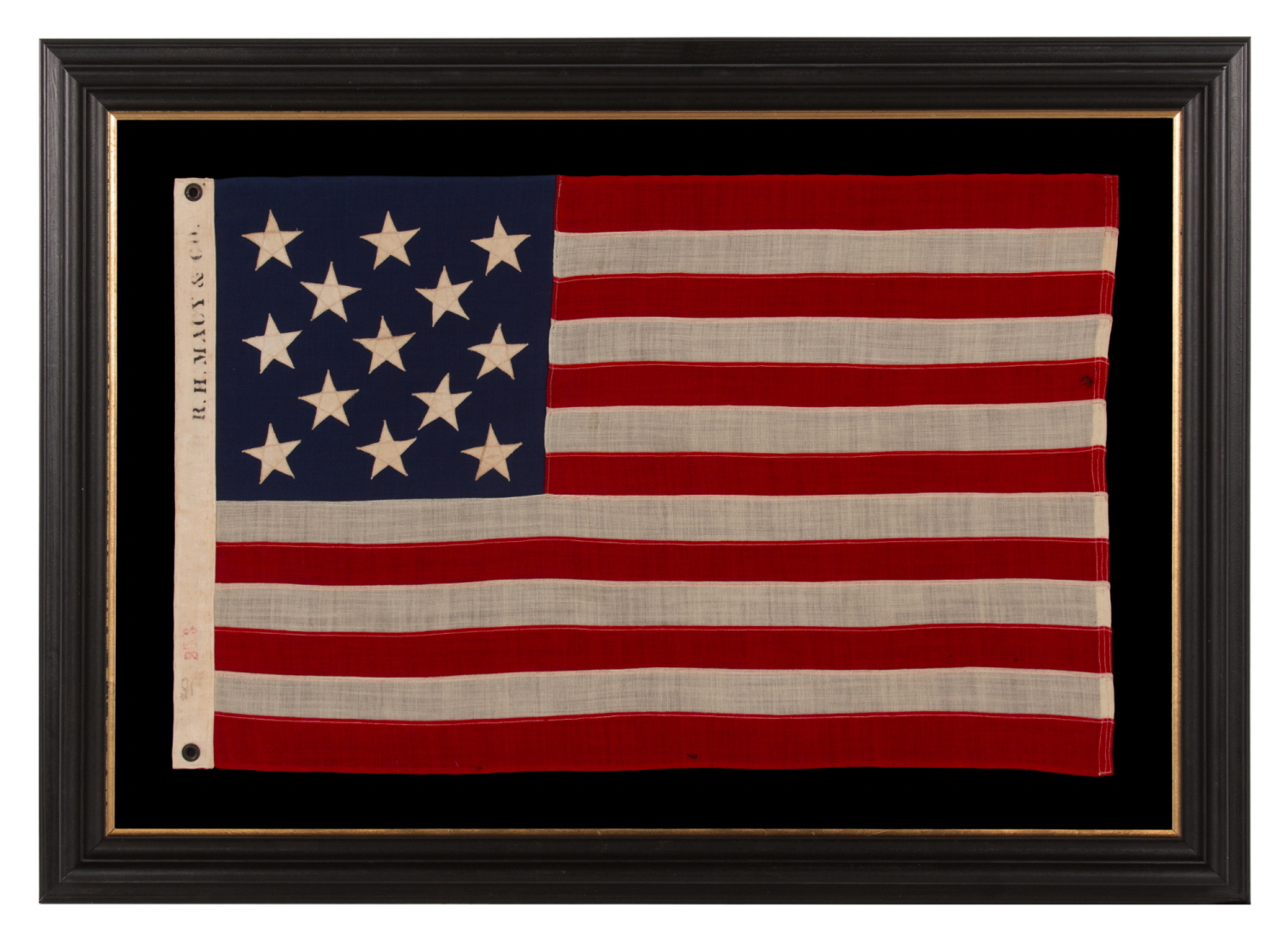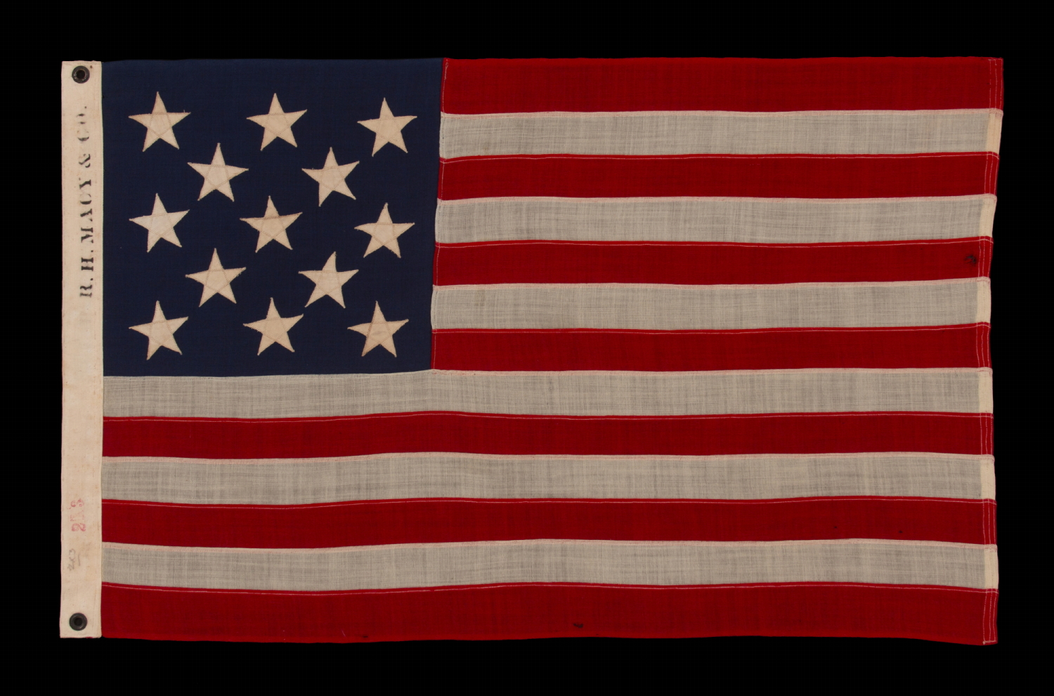 13 STAR ANTIQUE AMERICAN FLAG WITH A 3-2-3-2-3 CONFIGURATION OF STARS; A SMALL-SCALE EXAMPLE, MADE IN THE 1895-1926 ERA, MARKED “R.H. MACY & CO.” |