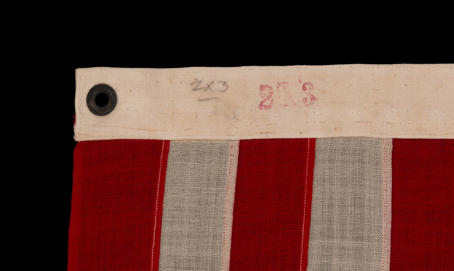 The canton and stripes of the flag are made of wool bunting that has been pieced with machine stitching. The stars are made of cotton and double-appliquéd (applied to both sides of the flag) with a zigzag machine stitch. There is a twill cotton binding along the hoist, with two brass grommets, along which “2X3” appears in a faded, red-inked stencil, and the same is hand-inscribed in pencil, to indicate size in feet.
