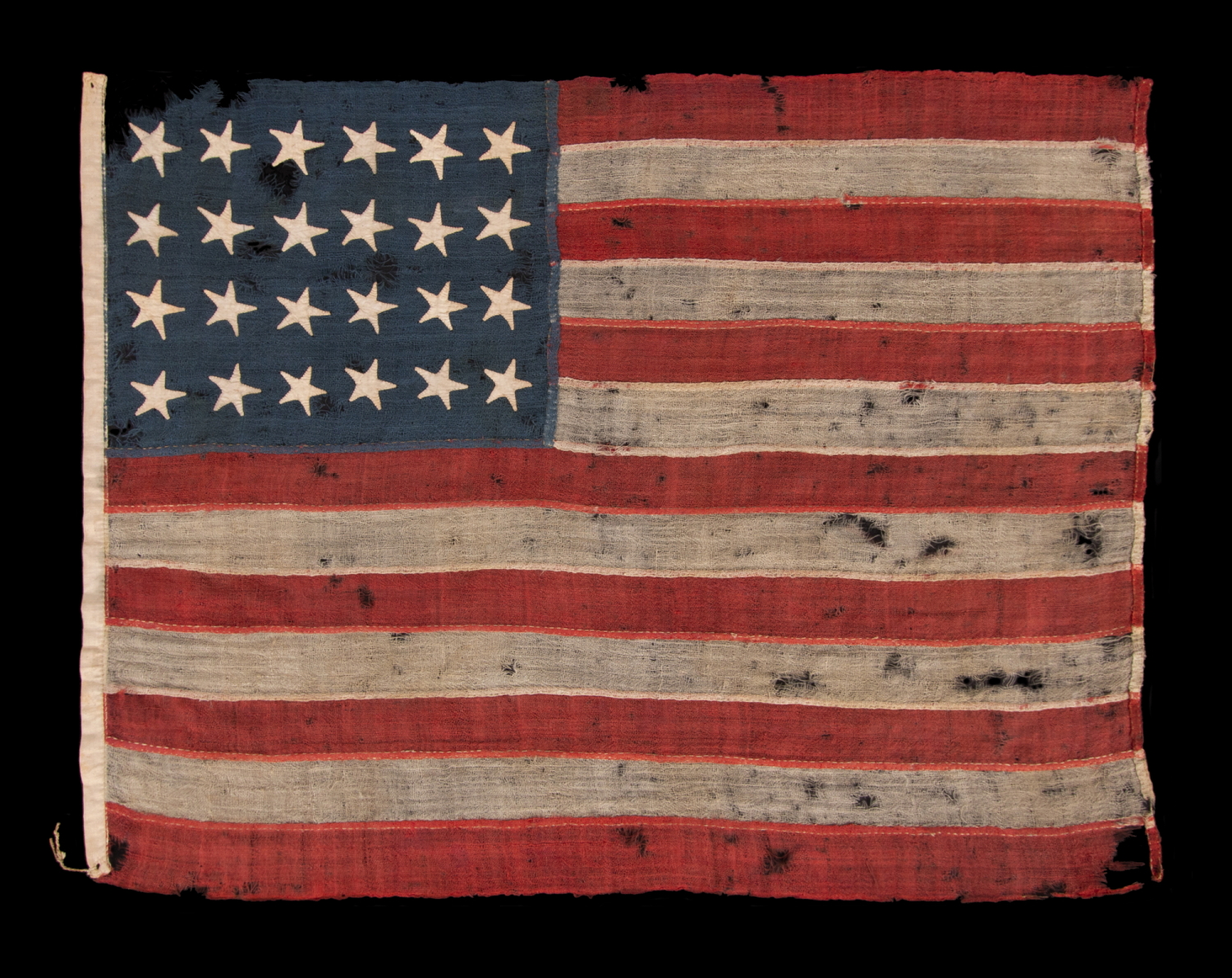 | 24 STAR ANTIQUE AMERICAN FLAG, MADE IN THE PERIOD WHEN MISSOURI WAS THE MOST RECENT STATE TO JOIN THE UNION, 1821-1836, EXTRAORDINARILY RARE, WITH ITS CANTON RESTING ON THE “WAR STRIPE” OR “BLOOD STRIPE," AND IN A REMARKABLY TINY SCALE AMONG FLAGS OF THIS ERA |