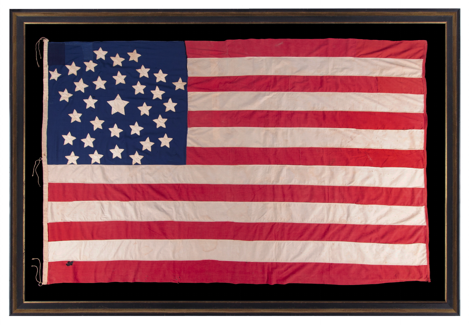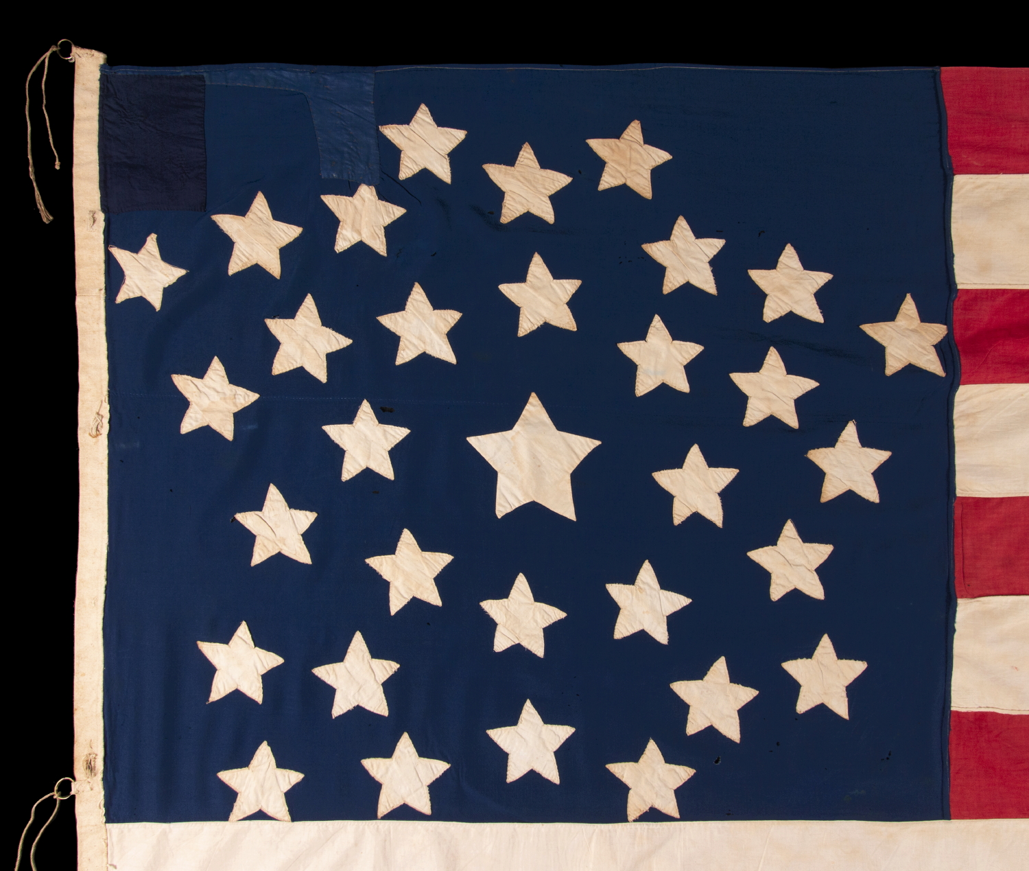 This particular 32 star American national flag was found in the attic of a home in Minnesota when it passed to the new owners many years ago. With its strong colors and intriguing presentation of stars, is one of the few examples known to survive from this exceptionally narrow window of time. I am aware of about 10 known examples with pieced-and-sewn construction, among which this is one.