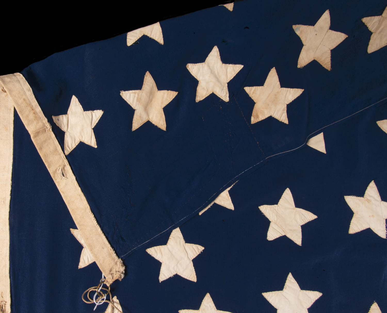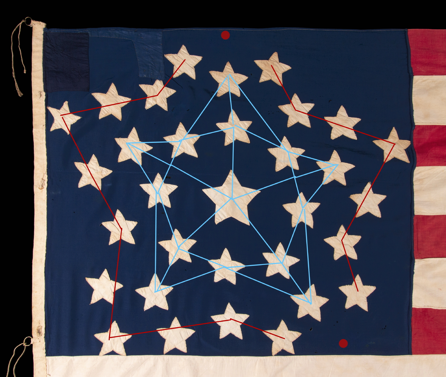 Made of cotton, hand-sewn, and double-appliquéd (applied to both sides), the stars of the flag are arranged in a variation of what is known as the “Great Star” pattern—one large star, made out of smaller ones. This particular version of the Great Star is highly unusual, because 2 of the stars that should be present in the canton, in the extreme position at the end of two of the arms, (directed at 12:00 and approximately 5:00,) are absent. This results in a feature that is referred to as a “notched” design, which allows space for the addition of more stars.
