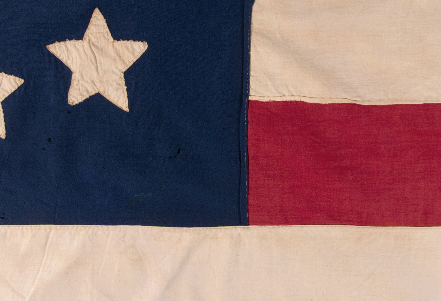 Condition: In addition to the repairs mentioned above, there is a stitched repair in the top red stripe (which we will remove when mounting). A seam was added to repair a tear at the fly end of the last red stripe, in which there is also a modest hole near the fly end, in addition to some very minor ones elsewhere, and a tear along the bottom edge. There is very minor foxing and staining throughout. Many of my clients prefer early flags to show their age and history of use. |