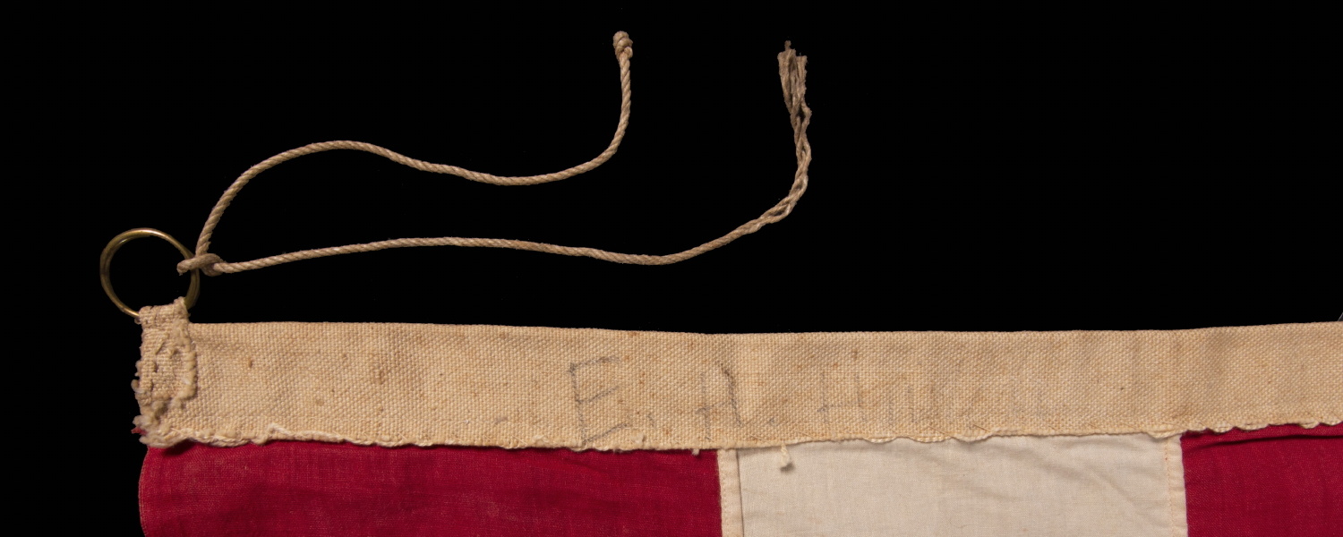 There is a penciled inscription on the reverse of the hoist binding, near the bottom, which includes the initials “E.H.” followed by what appears to be “Husted,” followed by the letter “y” or the letter “r.” If the latter is true, the name may be “Husteder,” but the writing is loosely defined and very faint. Whatever the case, this would be the name of a former owner and it was common to mark flags in this manner during the 19th century. Initial research into this name turned up nothing of interest. Such circumstance is not uncommon with regard to names present on early flags. Although I have become rather good at deciphering the characters when poorly written or faded, the information is typically too vague to yield meaningful results.