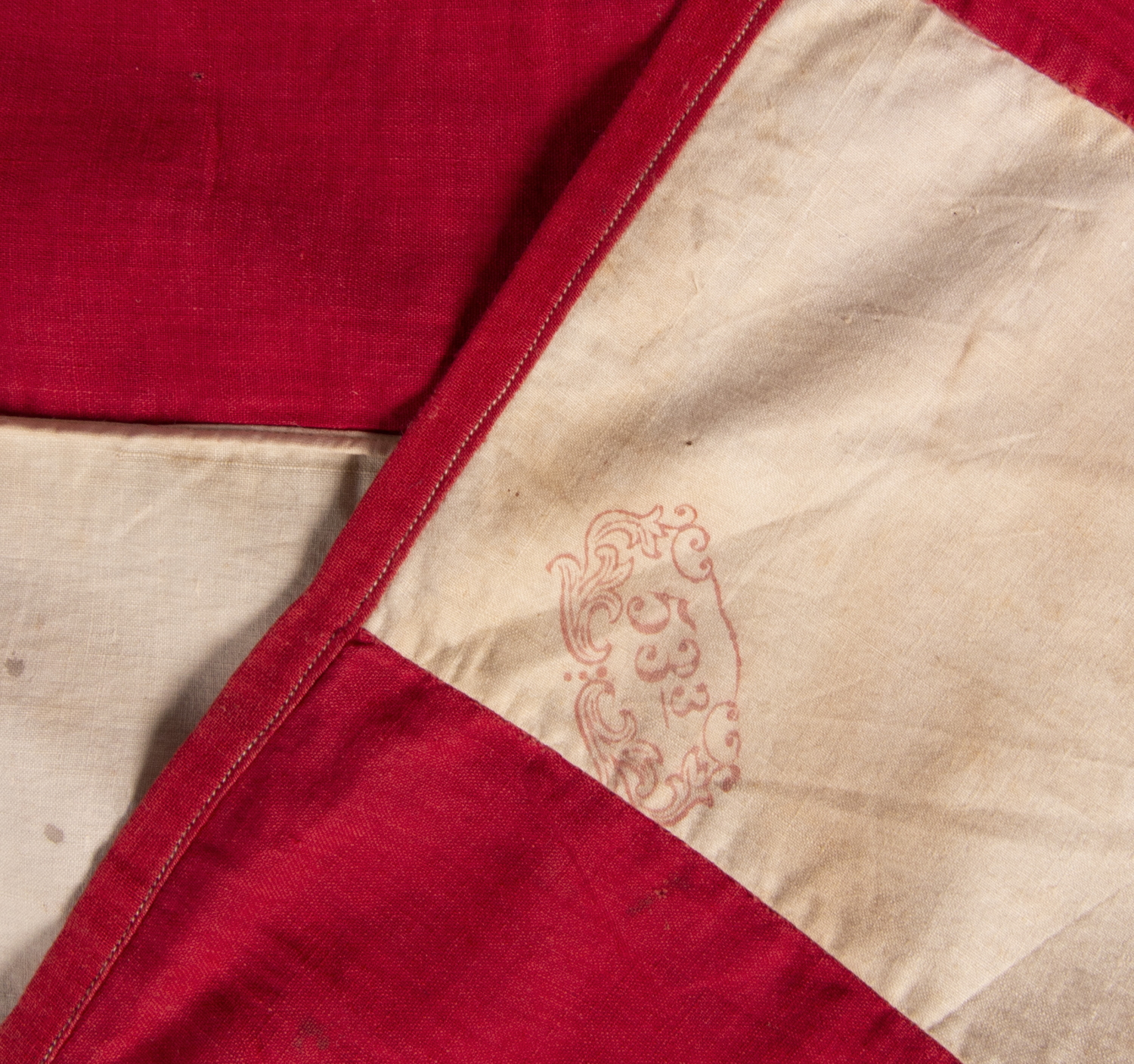 On the obverse (front), the large center star and one of the stars adjacent to it are hand-sewn. On the reverse, 21 of the stars, including the large center star, are hand-sewn. The remainder were appliqued with treadle stitching. The canton is made of fine merino wool. Due to the scale of the flag, this was pieced from two lengths of blue fabric, which were joined by hand-stitching. The stripes of the flag are made of cotton and are treadle-sewn. At the end of the 3rd white stripe, on the obverse, is a maker’s or merchant’s block-printed stamp with the numeral designation “533” surrounded by fanciful scrollwork. Rendered in red ink or pigment, this probably relates to the manufacturer or seller of the cloth and specified the yardage (or meters) on the particular bolt. Whatever the case may be, it is a very uncommon feature.