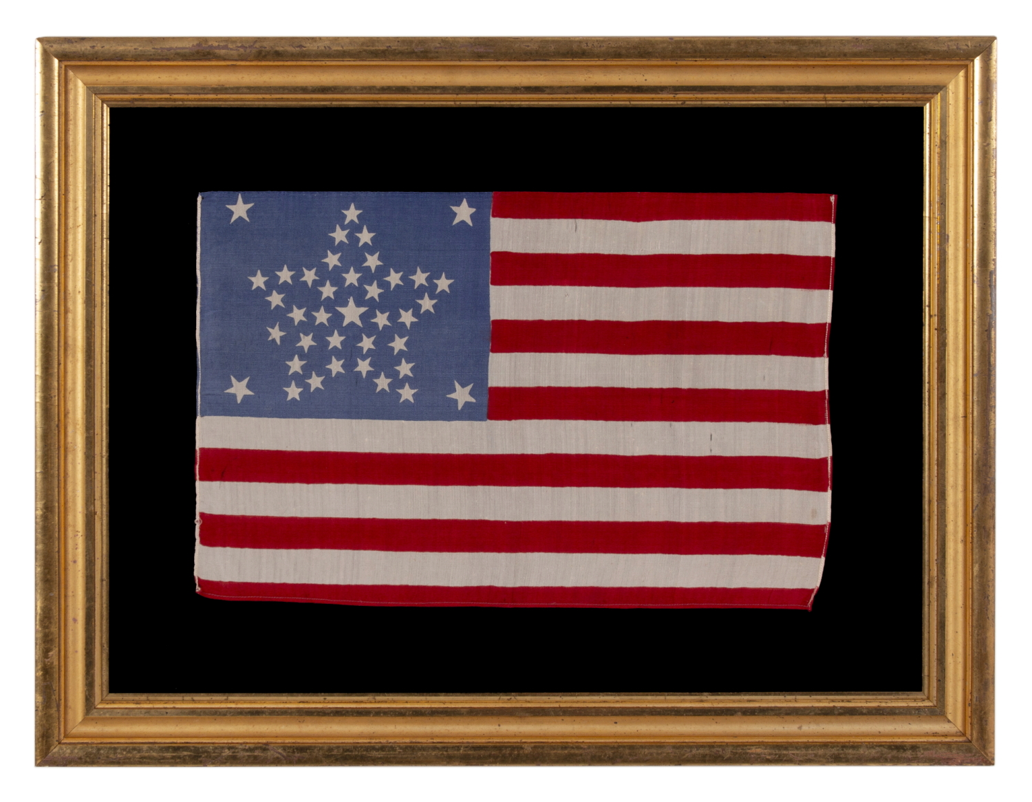 Of particular interest is the single star placed adjacent to the Great Star, outside the basic pattern, situated between two of its arms. Known as an “outlier,” its presence strongly suggests the design originated with 37 stars, and that the flag-maker added an extra, in lieu of re-creating the entire arrangement. Note how it also left 4 open spaces for Western Territories yet to be added.