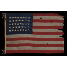 38 star American national flag in a bold yet manageable size among its 19th century counterparts with pieced-and-sewn construction. The stars are made of cotton, hand-sewn, and double-appliqued (applied to both sides). These are arranged in justified lineal rows in counts of 8-7-8-7-8. All of the stars are oriented in an upright position (with one point up). Note how the stars are corralled in a tighter regiment than usual, with a bit more blue of the canton around them than one might expect.