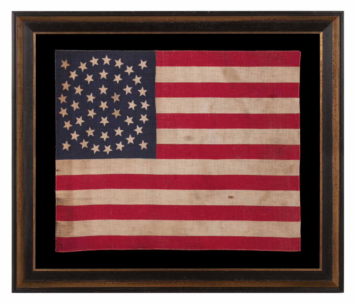 The flag has been hand-stitched to its background, which is 100% cotton twill, black in color, that was washed and treated for colorfastness. The black-painted, hand-gilded and distressed molding is Italian. The glazing is U.V. protective acrylic (Plexiglas). Feel free to contact us for more details.
