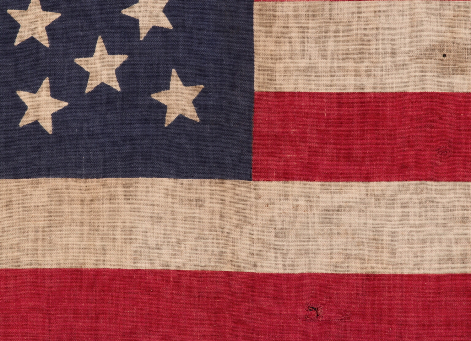 Condition: There is an L-shaped tear in the lower, hoist-end corner and there are tack holes along the hoist, where the flag was once affixed to its original wooden staff. There are minor to modest losses elsewhere in both the canton and the striped field. In some of these areas, period fabric was placed behind the flag for masking purposes, during the mounting process. There is minor to moderate soiling throughout, the most significant of which is along the hoist and in the first white stripe. There is a small dark stain in the 5th white stripe, toward the fly end. The flag presents beautifully. Many of my clients prefer early flags to show their age and history of use. |