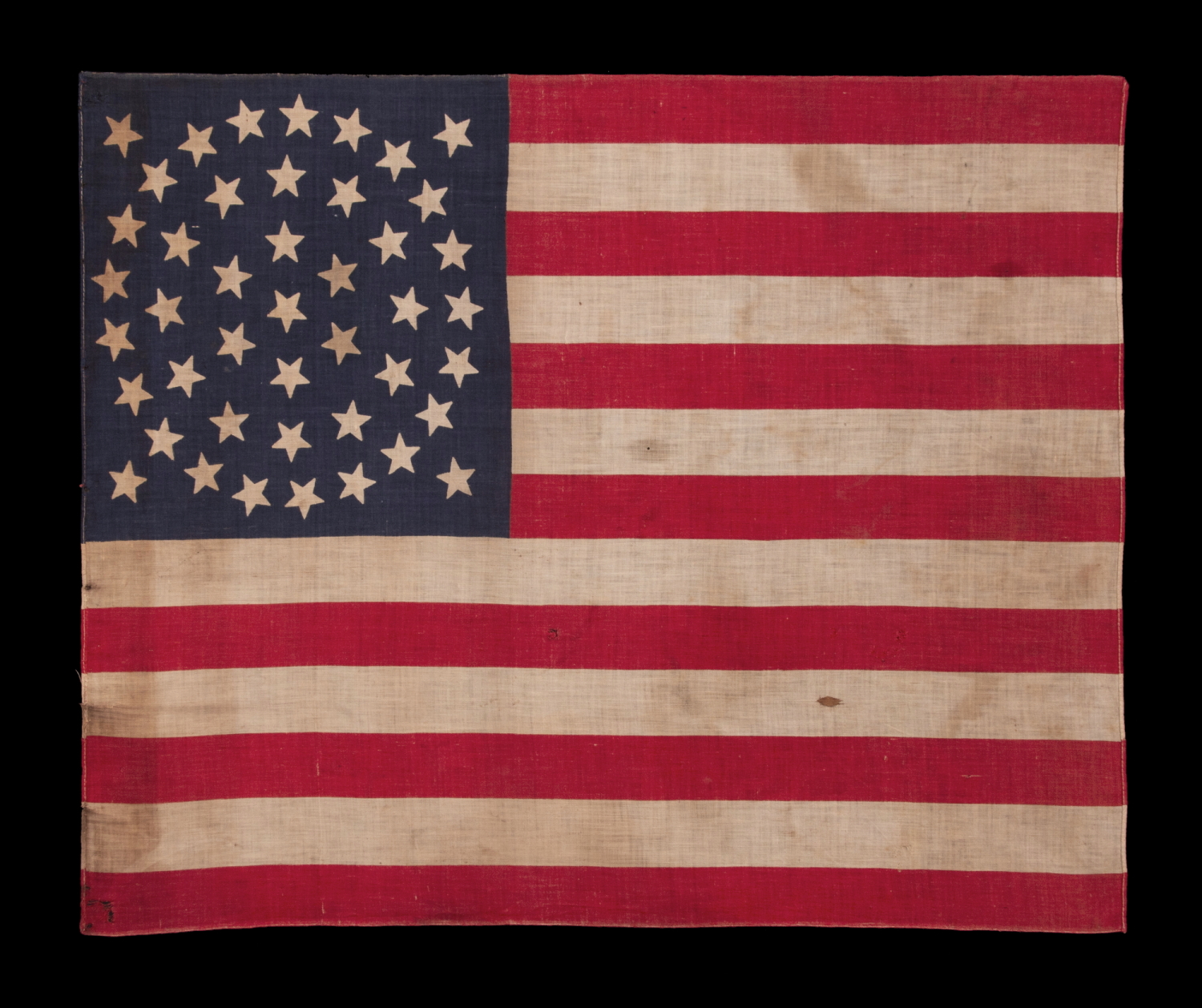 Note how this particular, orderly, circular arrangement, in such a large star count is somewhat reminiscent of a clear summer night sky, filled with stars. Also note that the canton is square, as opposed to rectangular, and how the proportions of the flag itself are somewhat more squarish than usual. Together these traits provide additional, visual peculiarities that impact to this great example of 19th century flag-making.