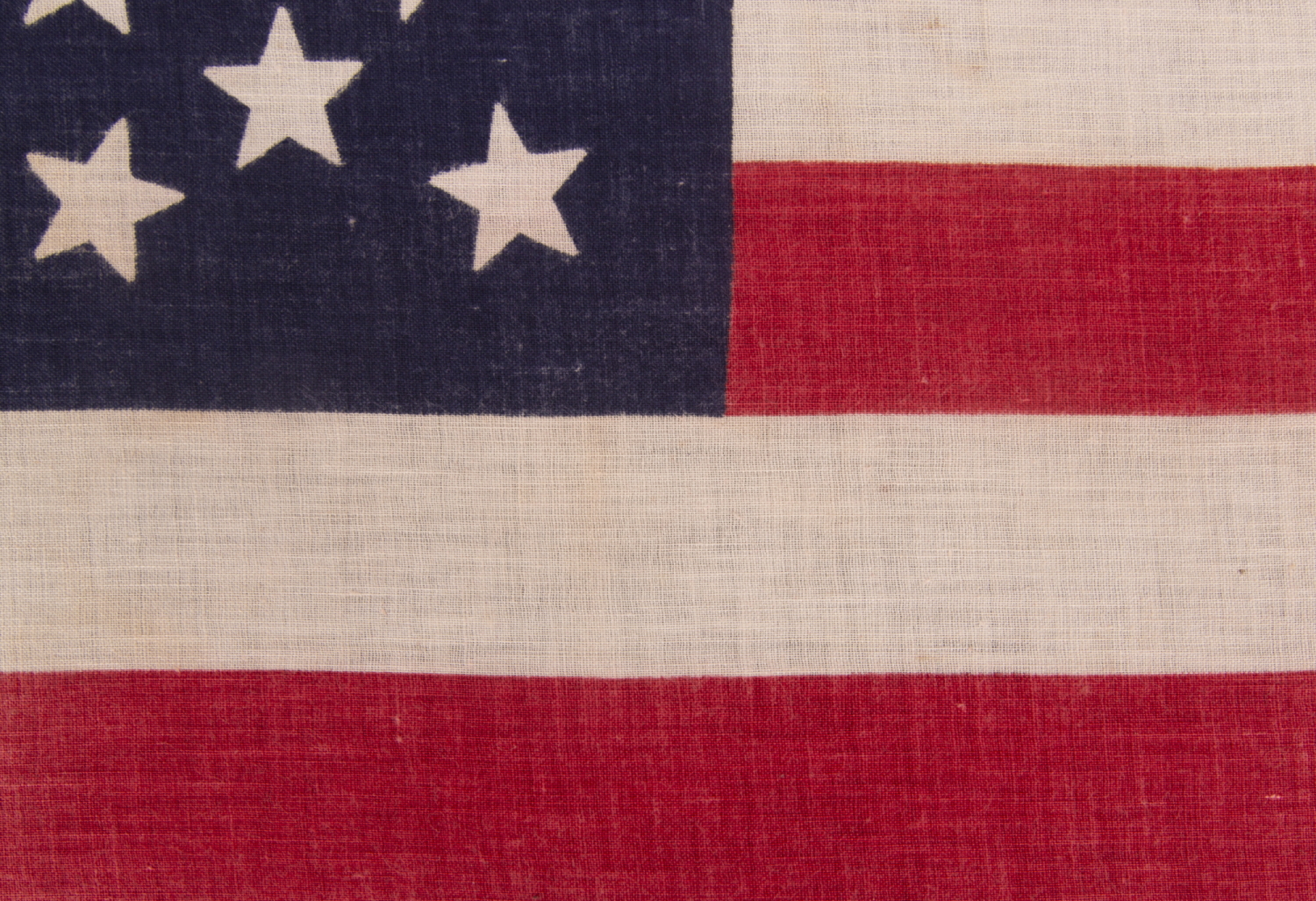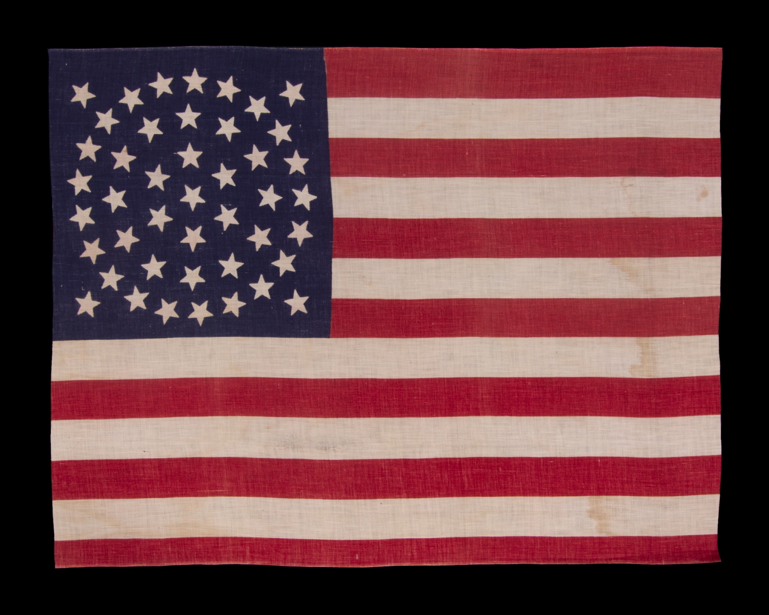 | 44 star American parade flag, printed on plain weave cotton. The stars are arranged in a circular medallion configuration that consists of three consecutive wreaths of stars, with a single star in the very center and a flanking star in each corner of the blue canton, outside the primary pattern. Variations of this beautiful and desirable arrangement are seen primarily in flags made between the Civil War (1861-65) and the nation’s centennial (1876). While there remained no official star configuration until 1912, flag makers basically abandoned circular, star-shaped, and other, dynamic, non-linear designs after the 38 star era (1876-1889). Examples with greater than 38 stars are rarely encountered. Note how this particular, orderly, circular arrangement, in such a large star count is somewhat reminiscent of a clear summer night sky, filled with stars. Also note that the canton is square, as opposed to rectangular, and how the proportions of the flag itself are somewhat more squarish than usual. Together these traits provide additional, visual peculiarities that impact to this great example of 19th century flag-making. It is interesting to note that I discovered a period image of this particular variety of parade flag, in an early postcard, made to advertise the Betsy Ross House in Philadelphia, which had, in 1898, been opened to the public as a museum. A photo of the front of the house shows two of these flags, affixed to staffs, propped at opposite angles in the front window. While perhaps difficult for the casual observer to identify, connoisseurs of printed flags may recognize their scale and iconic design. The postcard is hand-dated 1905. Wyoming became the 44th state on July 10th, 1890. Even though the 44 star flag was not official until July 4th, 1891, most flag-makers would have begun to add a 44th star to their flags as soon as Wyoming declared statehood, or perhaps even before the state was actually added. Because flag-making was a competitive venture, flag-makers did not want to be producing 43 star flags, for example, when their competitors were selling 44’s. The 44 star flag would have generally seen use until the addition of Utah in 1896. Mounting: For 25 years we have maintained a specialized department for this purpose. Our lead conservator holds a master's degree in textile conservation from one of the nation’s top programs. We take great care in the mounting and preservation of flags and related textiles and have preserved thousands of examples. The flag has been hand-stitched to its background, which is 100% cotton twill, black in color, that was washed and treated for colorfastness. The black-painted, hand-gilded and distressed molding is Italian. The glazing is U.V. protective acrylic (Plexiglas). Feel free to contact us for more details. Condition: There is minor yellowing and/or water staining in the white stripes, throughout, with modest occurrences of the same near the fly end of the 2nd, 3rd, 4th, and 6th of these, accompanied by two small spots of staining near the fly end of the 2nd white stripe. There is very minor fading, but there are no further issues worth mention. Many of my clients prefer early flags to show their age and history of use. |