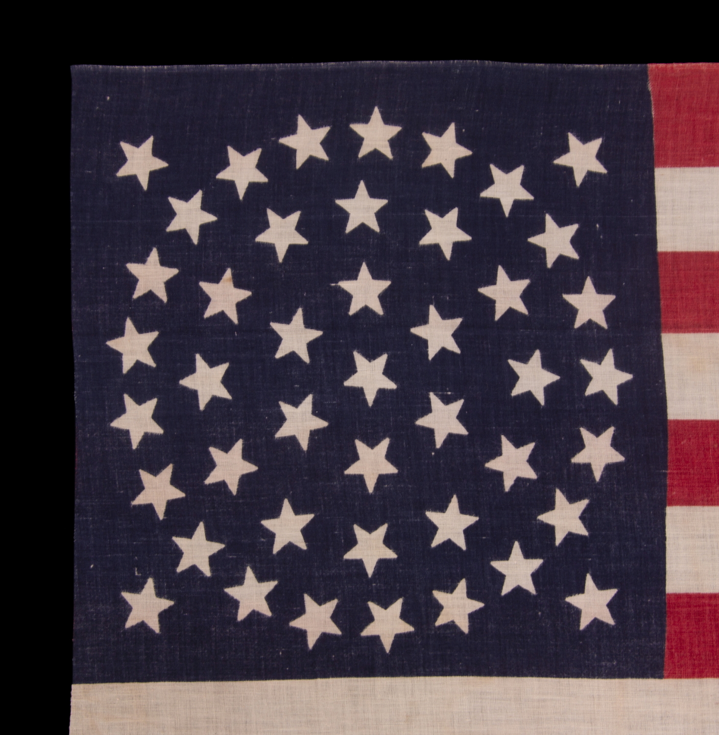 Wyoming became the 44th state on July 10th, 1890. Even though the 44 star flag was not official until July 4th, 1891, most flag-makers would have begun to add a 44th star to their flags as soon as Wyoming declared statehood, or perhaps even before the state was actually added. Because flag-making was a competitive venture, flag-makers did not want to be producing 43 star flags, for example, when their competitors were selling 44’s. The 44 star flag would have generally seen use until the addition of Utah in 1896.