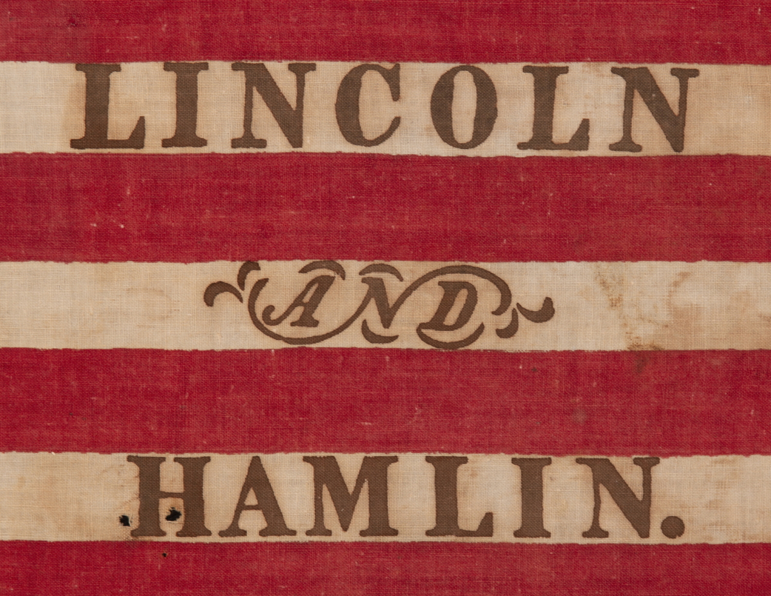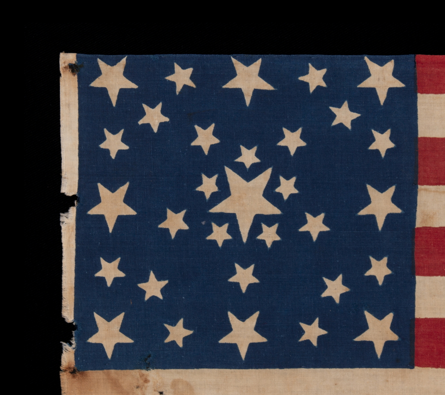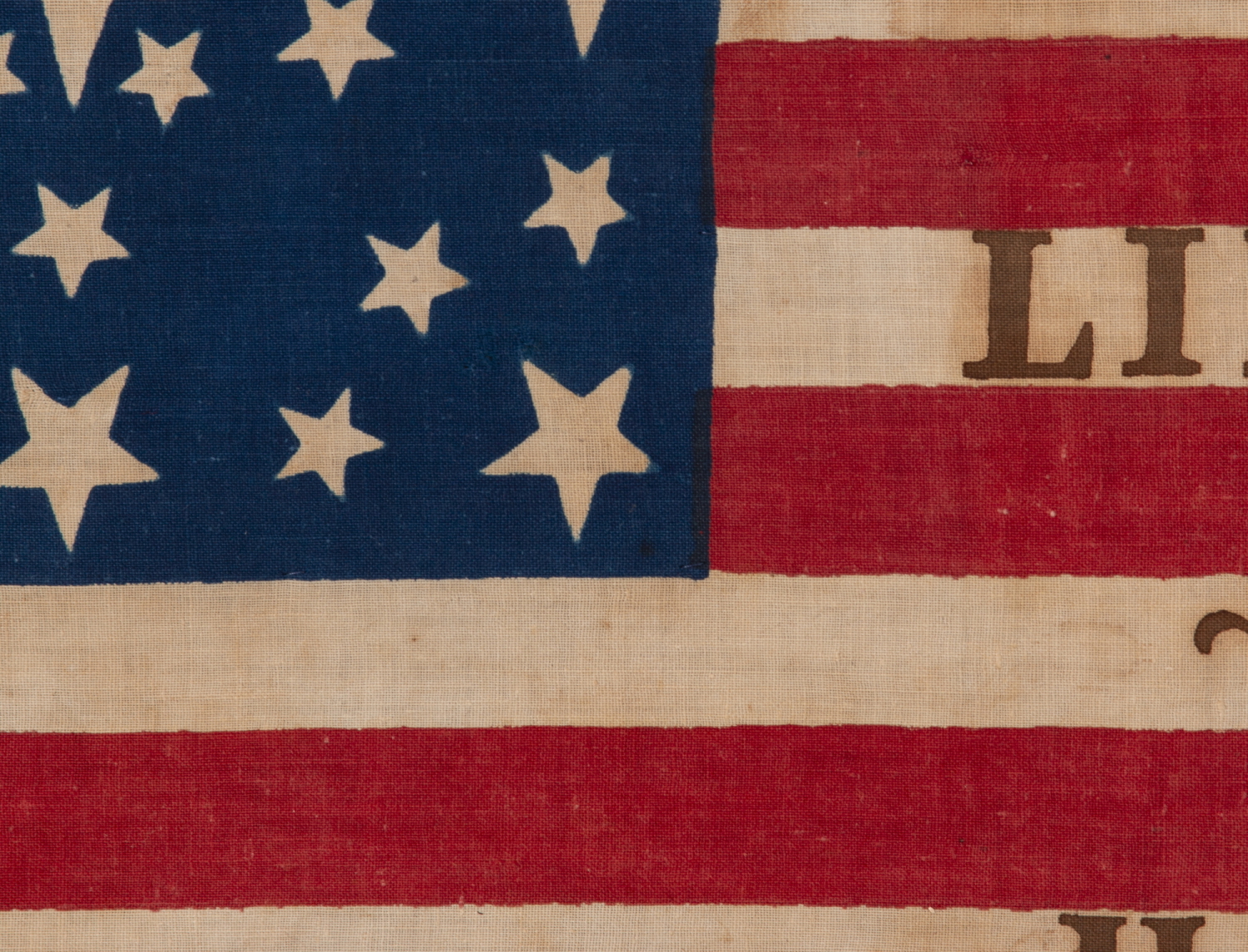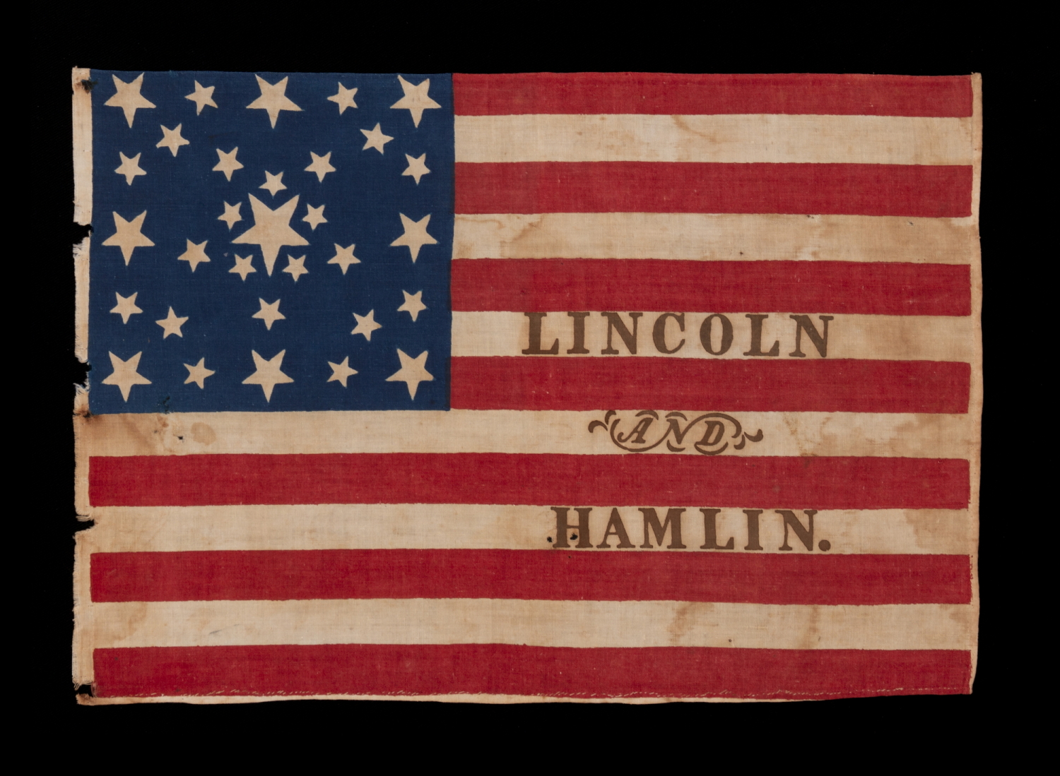 | ANTIQUE AMERICAN FLAG MADE FOR THE 1860 PRESIDENTIAL CAMPAIGN OF ABRAHAM LINCOLN & HANNIBAL HAMLIN, WITH 31 STARS IN A FANCIFUL STARBURST OR ‘GREAT STAR-IN-A-SQUARE’ MEDALLION; ONE OF THE RAREST AND MOST GRAPHIC OF ALL CONFIGURATIONS THAT HAVE BEEN IDENTIFIED IN 19TH CENTURY EXAMPLES; THE ONLY KNOWN LINCOLN CAMPAIGN FLAG IN THIS STYLE, AND ONE OF JUST 3 PARADE FLAGS OF ANY SORT THAT SHARE THIS SPECTACULAR STAR ARRANGEMENT |