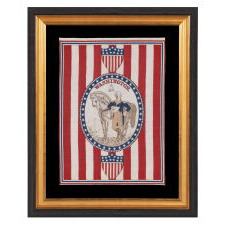 ANTIQUE AMERICAN PARADE FLAG / BANNER WITH A STANDING PORTRAIT OF GEORGE WASHINGTON & HIS HORSE, “BLUESKIN” SET WITHIN AN OVAL WINDOW, ON A GROUND OF RED & WHITE STRIPES, MADE FOR THE 1876 CENTENNIAL OF AMERICAN INDEPENDENCE