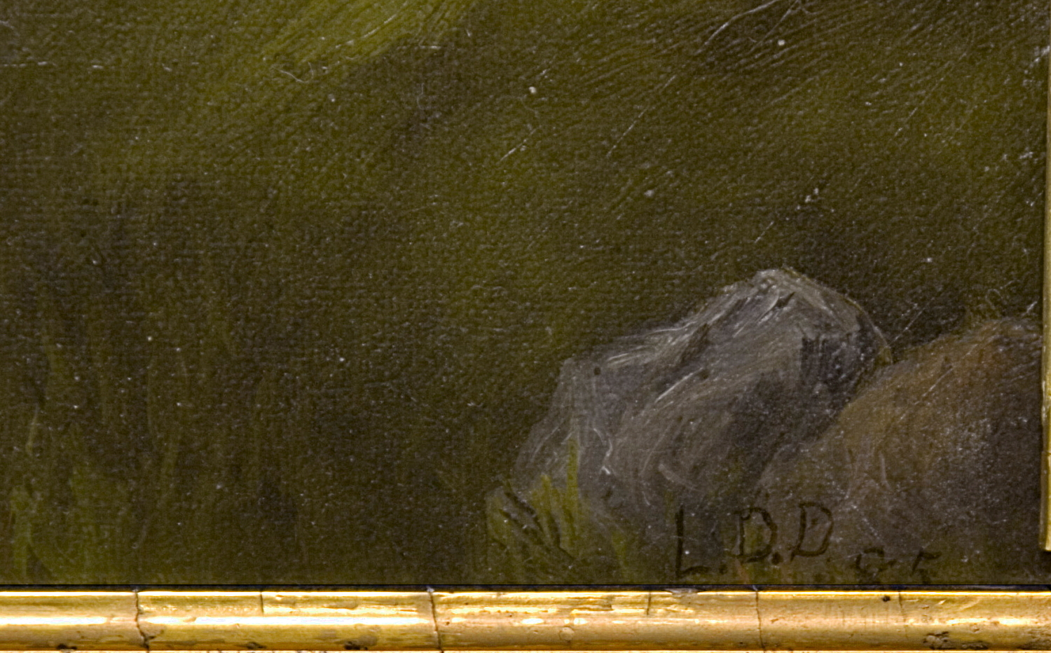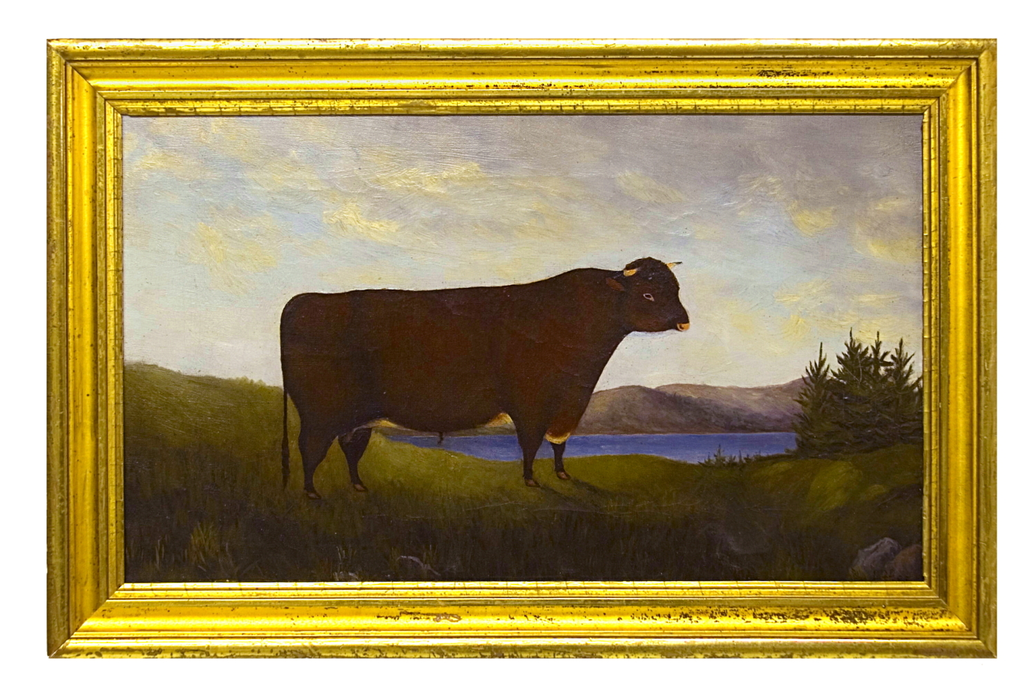 | Folk portrait of a bull in oil on canvas, signed L.D.D. and dated 1885. Found at an estate in the Hudson, New York area. The painting’s great style and presence in the stylized animal are enhanced by its elongated format and the artist’s strong use of color. The work has been married to this ca 1830-1860 gilt frame with exceptional coloration.
