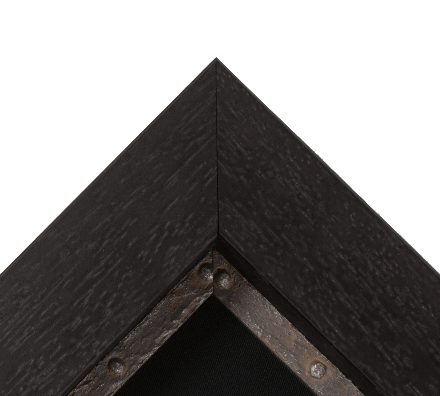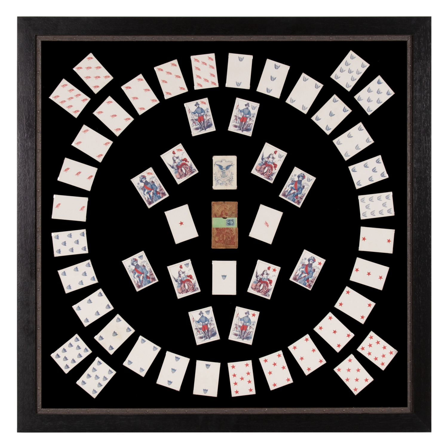 Mounting: The cards have been mounted using Mylar corners and so are easily removable. The background is 100% cotton twill, black in color, that has been washed and treated for colorfastness. The mount was placed in a rectangular, black-painted, Italian molding, to which a rippled-profile molding, black with gold highlights, was added as a liner. The glazing is U.V. protective acrylic (Plexiglas).