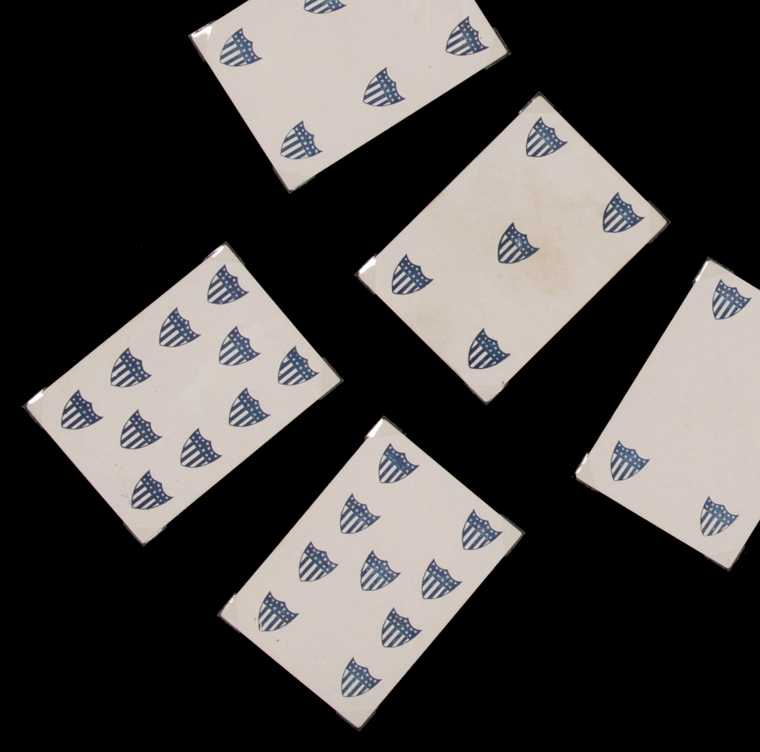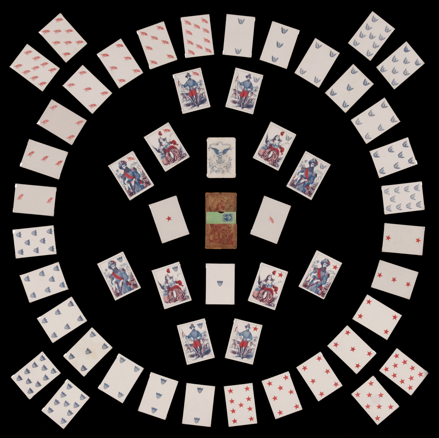 1862 Civil War playing cards with suits represented by stars, flags, shields, & eagles, in lieu of the traditional French suits of hearts, diamonds, clubs, and spades. The face cards feature Union Army officers and Lady Columbia [a.k.a. Lady Liberty, Goddess of Liberty]. Entitled “Union Playing Cards,” two versions of this deck were produced in New York by Benjamin W. Hitchcock’s “American Card Company.” This is the earlier of the two. The other was released in 1863.