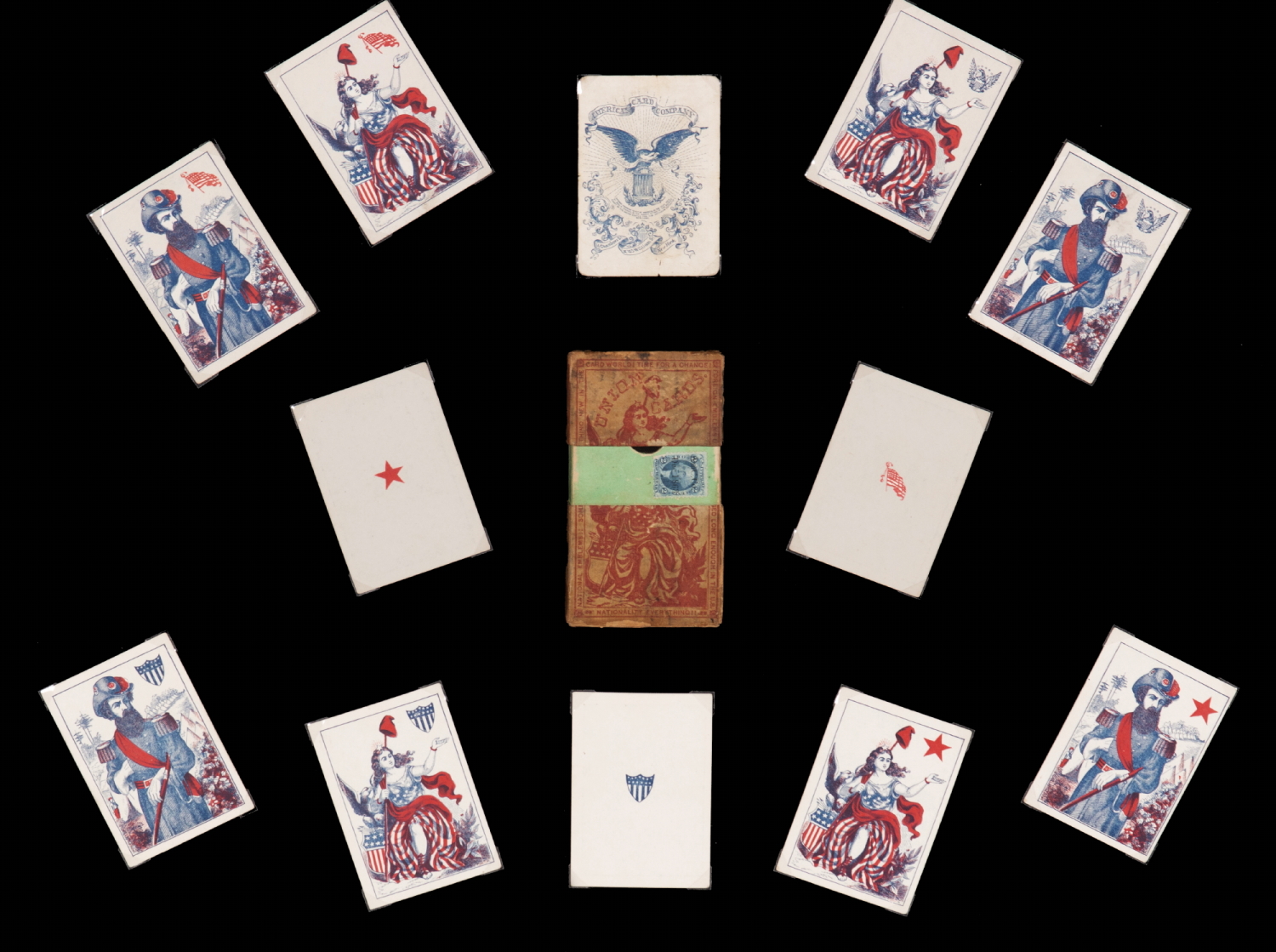 ANTIQUE, CIVIL WAR PLAYING CARDS w/ STARS, FLAGS, SHIELDS, & EAGLES, & FACE CARDS THAT FEATURE LADY COLUMBIA & UNION ARMY OFFICERS; MADE BY BENJAMIN HITCHCOCK, NEW YORK, 1862 |