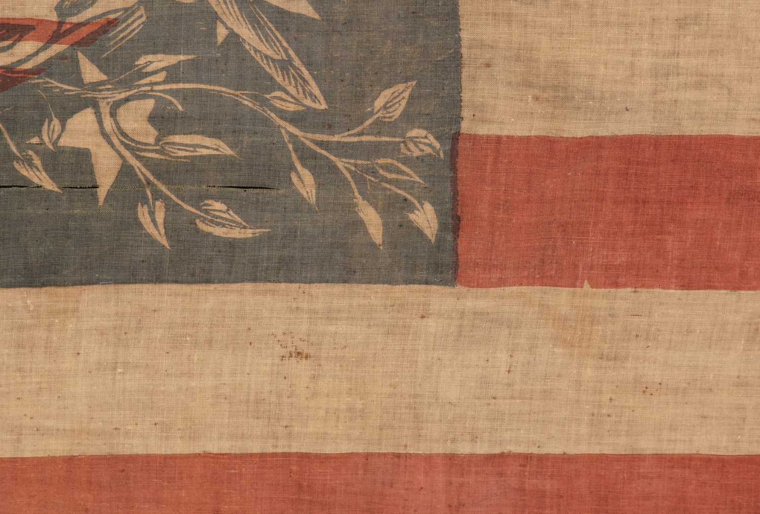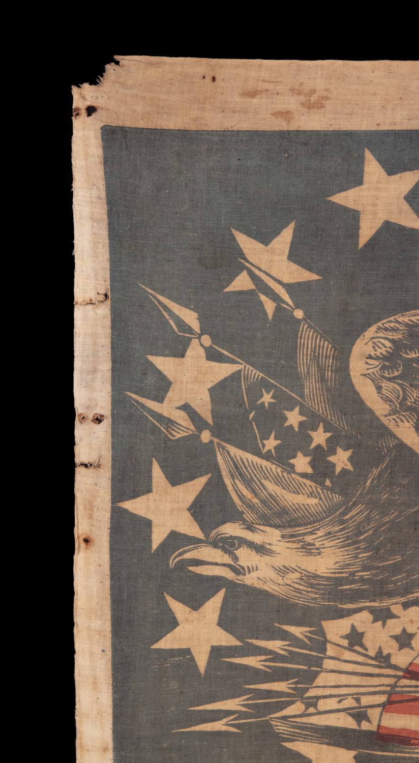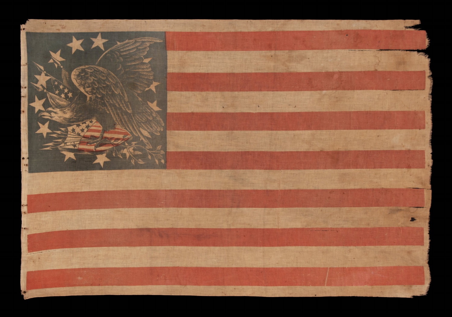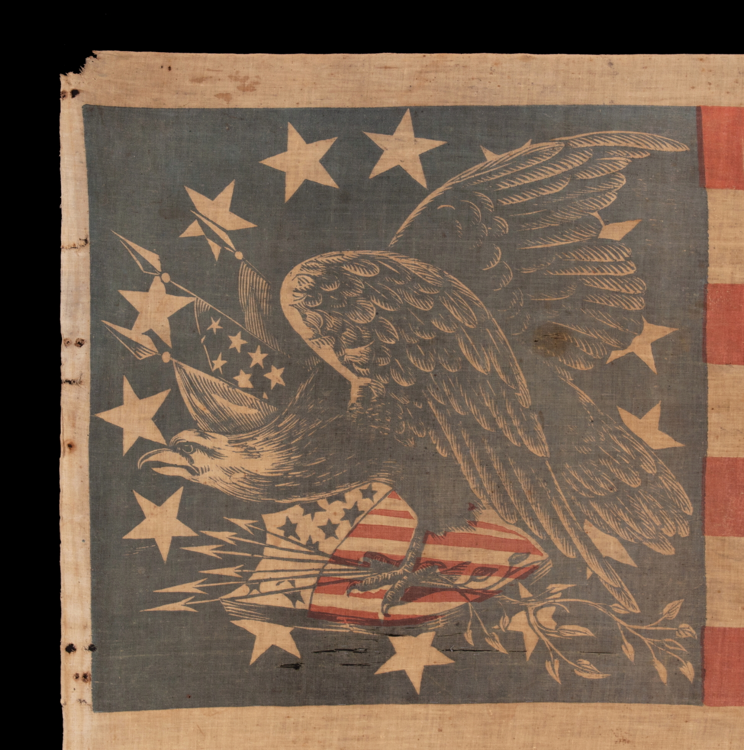 | Made sometime in the period between the Mexican & Civil Wars, 1846-1865, this exceptional parade flag stands easily among the contenders for the best one may ever encounter. Flags with eagles that serve as the primary image in their cantons are rare in general, surviving more in early illustrations than they do “in the cloth,” so-to-speak. Among printed parade flags, waved at parades and political events, the total is somewhere in the realm of 15-20 examples, most of which I have had the great privilege to own at one time or another. The canton of this flag features a device that is different from any of its scarce counterparts. This consists of a warlike eagle, on the offensive, standing upon a federal shield, with neck outstretched above 6 arrows, all aimed in the direction of its gaze, and the olive branch clearly trailing behind. To the upper left is a stand of flags, with the Stars & Stripes at their center. All of the above is superimposed upon a single wreath of 14 stars. One of the most notable and incredibly rare characteristics present in this example is the use of a third color within the canton. While one of the known eagle variants presents the entire device in red (unique to that flag), just two other parade flags with eagles in the canton incorporate an additional color past blue and white. One, with 34 stars in a single wreath and 4 outliers, is documented in "The Stars & The Stripes: Fabric of the American Spirit" by J. Richard Pierce (2005, J. Richard Pierce), p. 62. The other, with 32 stars (30 + 2 outliers), survives in a private collection. Both of these I was privileged to have once owned and sold to their respective owners. In addition to the simple fact that it features a federal eagle to begin with, and the flag’s incredible graphics, the most obvious and important trait is the scale of this example among its known counterparts. During the 19th century, parade flags, in general, tend to be 3 feet long or smaller on the fly. Most of those with eagles, specifically, measure less than two feet in length. A fair number fall short of 12 inches. At 36 x 53 inches (3’ x approx. 4.5’), this is the largest example that I am aware to exist, for which I know the measurements. One, among the holdings of the Smithsonian’s Division of Political History, measures 33 x 47 inches [See “Threads of History” by Herbert Ridgeway Collins, Smithsonian Press, 1979, plate 435, p. 206. Misdated 1876. Correct date is 1863-65]. Another, that I acquired and sold many years ago, is fractionally larger on the hoist, at 36.75 x 47 inches (includes a two-inch, applied banner). I am aware of another large contender in a private collection, that I once viewed images of, but for which I was never able to ascertain the exact scale. Block-printed on cotton, or a cotton-flax blended fabric, the additional expanse of white present above and below the stripes, ending in selvedge, reflects the difference between the size of the blocks that the printer employed, and the width of the bolt of cloth. Several aspects of the image of the eagle device are worthy of comment. One, while an eagle facing a cluster of arrows may not reflect wartime production in every instance, here it almost certainly does. The feature is so prominent, in this instance, that it would be hard to convey a more meaningful message. While earlier artwork was sometimes copied, I further doubt that was the case here. This is a distinctive Mexican War – Civil War era eagle, possibly copied within this time frame, from the earlier war to the latter, but not outside it. The star count is somewhat of a mystery. It may be that this was intended to be 13, and that the total got lost in the shuffle, so-to-speak, either obscured by the remainder of the imagery, or for some other, unknown reason. And while some might suggest it to have been a subtle way to reference Vermont as the nation’s 14th state, I find that explanation unlikely in this instance. Vermont was not a mecca of flag production and the number of stars is obscured as opposed to having been prominently featured. One very worthy possibility of consideration would be that the 14 star count was employed to reference the number of Free vs. Slave States. On paper, this would place the date between 1845-1848, following the addition of Iowa as the 14th of the former on December 28th, 1846 (agreed to in 1845, per the Missouri Compromise of 1820). This was a time of heated political agendas, as the ability to add more Slave States evaporated with the December 29th, 1845 addition of number 15 in that column, Texas. The count of 14 Free States remained until the May 29th, 1848 admittance of Wisconsin in the North, which balanced the scales. A year later, the discovery of gold in California brought forth an almost inevitable outcome and the pot soon boiled over on the slavery issue. Though the practice of making what the newspapers would refer to as “Disunion” flags does not seem to have been reported on until the 1850’s, the survival of actual flags, with what I now believe to be Southern-exclusionary star counts, suggests that it occurred at least as early as the time of the Missouri Compromise itself, if not perhaps prior. Having had the opportunity to own, physically hold and compare, literally thousands of 19th century parade flags, including almost all of the known examples with eagles, I can confidently say that the printing, the fabric, the colors, the design, and the size, all indicate a significant possibility of Mexican War era origin. Though private use of the Stars & Stripes during the Mexican War was scant at best—even the Army, itself, was not authorized to carry it on foot until 1834 (artillery) and 1841 (infantry), with cavalry not following until the second year of the Civil War (1862)—printed flags of the 1840’s tend to be larger in scale than those that followed. This is hardly conclusive, but since only 1% or so of what has survived into the
