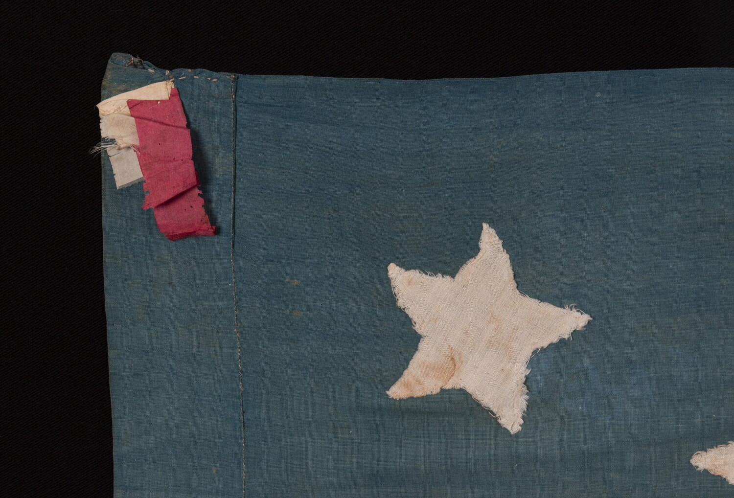 | All manner of symbolism can be seen in the flags of the latter antebellum through the Civil War. Makers in the North did all sorts of things to eliminate both the Slave States and those that actually seceded. In the South, during the war, the precise opposite happened occasionally, with Southern makers removing Northern States. Due to the great liberty that Americans were afforded with flag design in general, and the lack of any sort of laws or policing with regard to flag manufacture, the creativity of flag makers both commercial and private was rampant. Driven by the issues of slavery, and of state-associated politics, as well as the fear, fervor, and patriotism generated by war, all kinds of both graphic and symbolic expression appeared in both flags and related textiles. The presence of such features resulted in what many would today argue are the most visually striking and academically intriguing flags that survive from any point in American history. This particular 13 star American national flag, made during the Civil War (1861-1865), displays several rare and beautiful aspects that are desirable in flag collecting. Note how the canton, in a beautiful shade best described as somewhere between cornflower and Prussian blue, is set within a field of just 9 stripes, likely to reflect the omission of North & South Carolina, Georgia, and Virginia, the 4 Slave States from among the original 13 that seceded from the Union, while at the same time echoing the earliest, red and white-striped flags of the Sons of Liberty. Although Lincoln made a case for not removing the Southern States from the flag, this being conceptually at odds with his goal to keep the Union together, flag-making was personal, there were no ‘flag police,’ and there was very little legislation whatsoever before 1912. Federal guidelines concerning flag etiquette were not addressed until the United States Congress adopted the Flag Code in 1923. Prior to this time, the design of the American National Flag was left to the whims of the maker, with all aspects thereof subject to both emotion and artist's liberty. Note the elongated format that results from the 9 stripe feature in this instance, which adds an interesting visual element to the flag’s design. Also notable is the wide hoist, blue in color, in the form of an open sleeve, through which a wooden staff could be passed, and the red binding along the fly, both of which are unusual and contribute substantially to its presentation. Note how the blue canton rests on a red stripe. When this condition occurs, some flag historians refer to it as the “blood” or “war” stripe, suggesting that the flag was sometimes constructed in this manner when the nation was at war. Since there were no prescribed proportions for the flag itself, or its canton, or any specified position of the canton against the striped field, until 1912, there was no right or wrong in this regard. Because the overwhelming number of surviving flags, like those of today, made inside and outside wartime, present with their canton resting on a white stripe, the rarity of the war stripe feature, as well as the emotionally compelling myth behind it, is very desirable among collectors. Interestingly enough, when present, the characteristic tends to occur most often in the homemade flags of both the Civil War and, curiously, World War I. At first glance, it appears that the maker of the flag may have intended to arrange the stars in rows of 3-2-3-2-3. The only place that this design was successfully achieved, however, occurs within the bottom two rows. Continuing upward, any semblance of a regimented pattern disintegrates into a random scatter, the result of which adds a wonderful element of folk quality to the presentation. Homemade and entirely hand-sewn throughout, with tiny stitches and great precision, the flag is constructed entirely of plain weave cotton. While a poor fabric for flags intended for long-term outdoor use, as cotton absorbs water, became heavy, and was thus subject to tearing and rot, it was nonetheless the fabric of choice for homemade flags. Unlike wool bunting, an open weave fabric used exclusively for the commercial manufacture of flags and banners, and silk, which was both delicate and costly, cotton was inexpensive and widely available. Among other purposes, flags such as this were made as gifts, to be presented to Civil War companies of soldiers. The remnants of a silk rosette, affixed by hand-stitching in the upper, hoist-end corner, tends to suggest such manufacture, perhaps by the wife or mother of a soldier or officer, or an admirer thereof. I have encountered similar elements on other homemade examples of the Civil War period, both on flags with known history to a company of soldiers, or on those suspected of such. Some of these would have actually been carried in the field, while others, such as this example, more likely to have been brought out for parades and other ceremonial function, absent of significant wear. The great care in which such flags were held by the recipient or unit, however, may disguise the incidence of battle use. At approximately 6 feet in length on the fly, although this may seem large in a modern context, sewn flags of the 19th century, (as opposed to printed parade flags,) were generally 8-9 feet long and larger. At this time in American history, it was important for flags to serve their intended function as signals, to be recognized at great distance. Even those flags made for decorative use tended to be far larger than their modern counterparts. Because smaller flags are easier to conserve and frame for indoor display, the size of this particular example is desirable for both collectors and one-time buyers alike, small enough to be manageable, but large enough to make prominent visual impact. 13 star flags have been flown throughout our nation’s history for a variety of purposes. They were hoisted at patriotic events, including Lafayette’