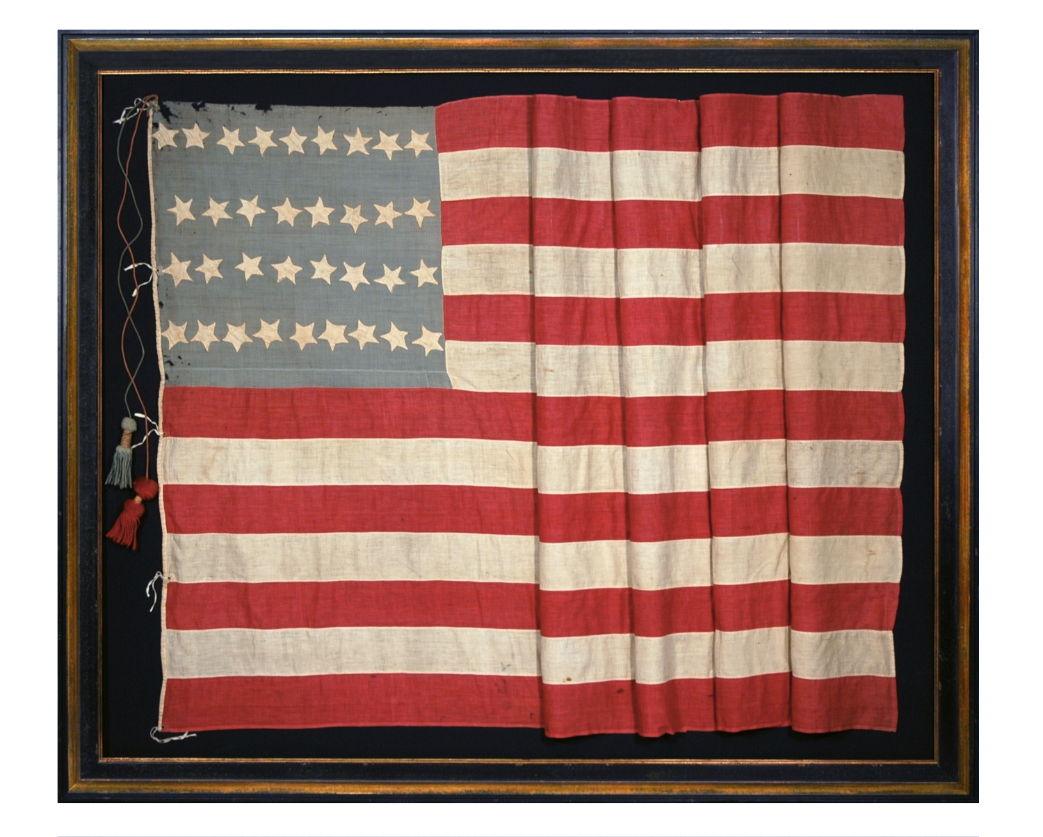 34 STAR ANTIQUE AMERICAN FLAG, MADE DURING THE OPENING TWO YEARS OF THE CIVIL WAR, 1861-1863, WITH AN UNUSUALLY ELONGATED FORMAT, A SQUARE CANTON WITH AN ATTRACTIVE SHADE OF BLUE, LARGE, MAKE-DO TASSELS, AND WITH ITS CANTON RESTING ON A RED STRIPE – SOMETIMES TERMED THE ‘BLOOD’ OR THE ‘WAR’ STRIPE; REFLECTS THE PERIOD WHEN KANSAS WAS THE MOST RECENT STATE TO JOIN THE UNION |