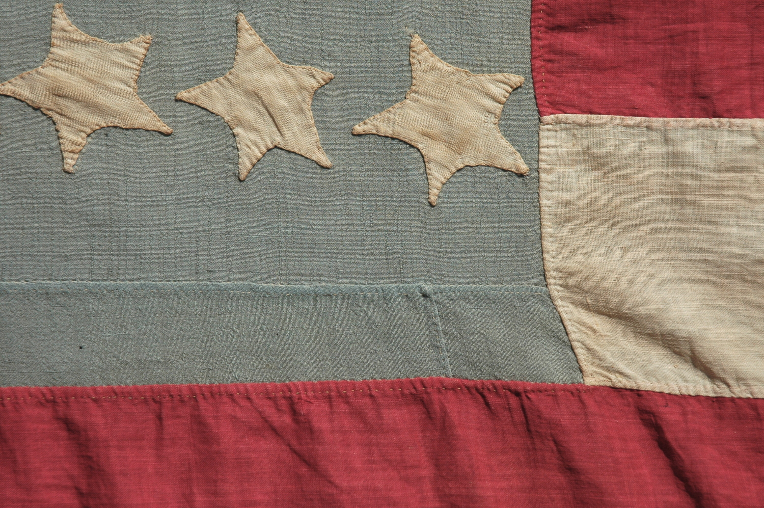 The stars of the flag point in all directions and there is lots of variation in their whimsical, starfish-like shapes. Made of cotton that has lightly oxidized to an attractive, golden brown color, the stars are double-appliquéd (applied to both sides) and placed in loosely defined rows of 9-8-8-9. The flag is entirely hand-sewn with the same kind of fine stitching and great precision that is seen in the silk battle flags of this same period and prior. The stripes are made of cotton bunting. There are five, tiny, hand-sewn, whip-stitched grommets which are unusual because they are sewn into the weak cotton bunting, yet rely on the cotton reinforced binding along the hoist end to keep them from tearing. A cotton tie is threaded through each grommet.