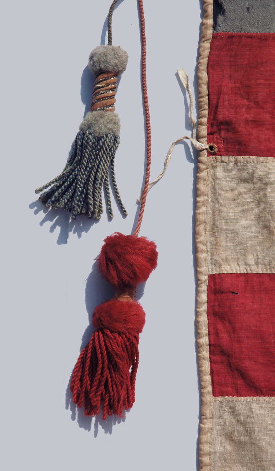 The tassels at the hoist end are also very strange. Each is made of a turned piece of wood, which is wrapped in tufted wool, draped at the end with twisted woolen cord, and attached to the flag with a type of woolen covered cording that is often seen in various Civil War military items. The wooden center of the red tassel is wrapped in red thread, part of which is unraveled and absent. The other tassel bears the same dusty blue color as the canton, and its center is different. A spiral groove is hand-carved down the wooden core, and a piece of fancy silk ribbon runs through this ditch. One might suggest that this color is a result of fading or a fugitive, home-dyed process, but it may be that the scarcity of blue fabric resulted in the choice of fabrics. Based upon surviving Civil War flags, it is obvious that blue cotton was a scarcity. There was no official shade of blue for the American flag until 1912, and flag-makers use what they wished. Such creativity is the lifeblood of folk art in early Stars & Stripes.