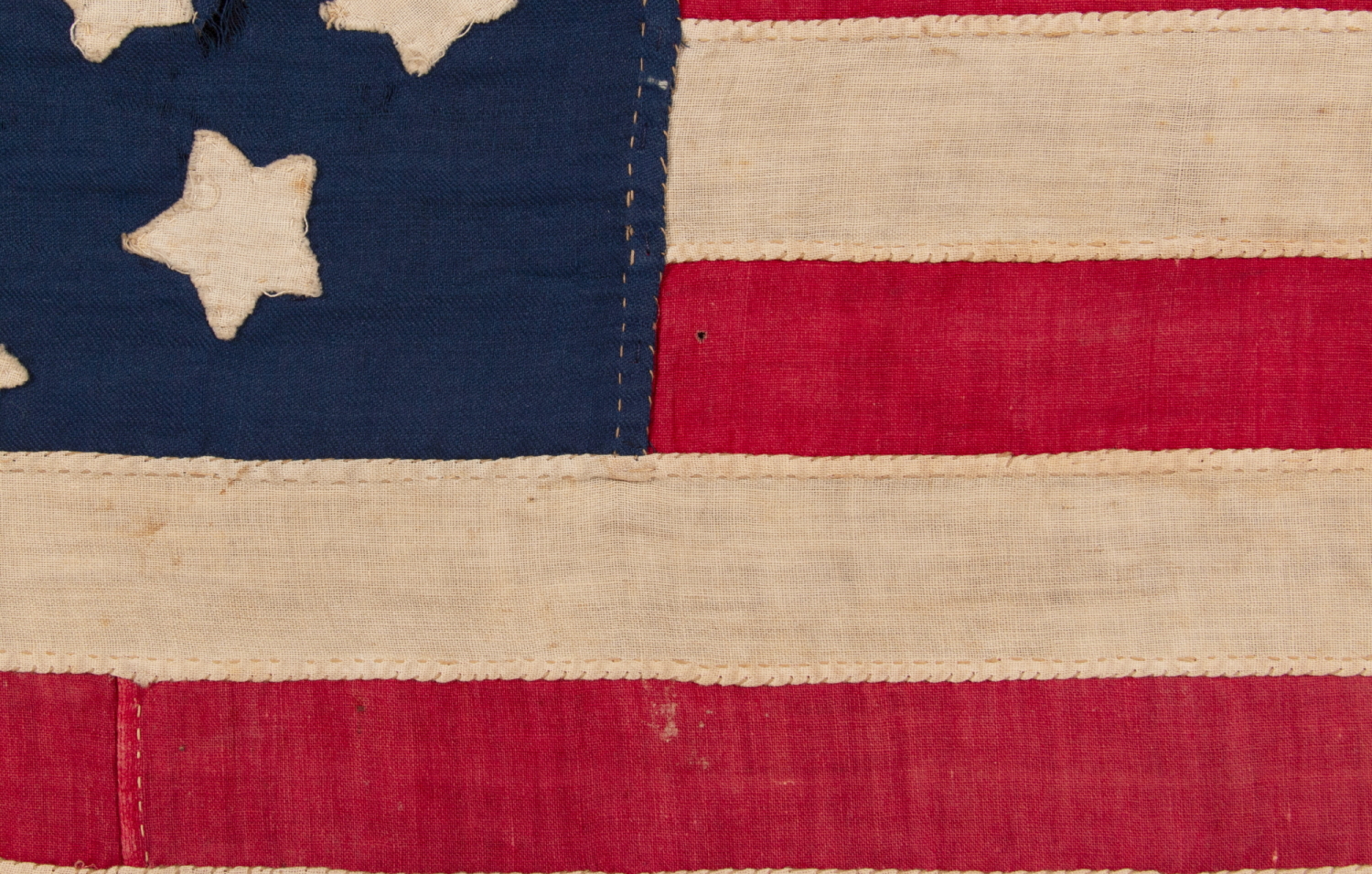 In the 19th century, most flags with pieced and sewn construction were 8 feet long and larger. A six-footer was considered small. Even military battle flags, carried on foot, measured 6’ x 6.5’, which translates into approximately 7’ x 7.5’ after framing, about the size of an average quilt and larger than can comfortably fit on a wall in a house with 8-foot ceilings and average width baseboard. Flags smaller than this exist, but the smaller they get, the more unusual they are. At just 1.5’ x 3’, this is about as small as one will ever encounter in a sewn flag of the Civil War era.