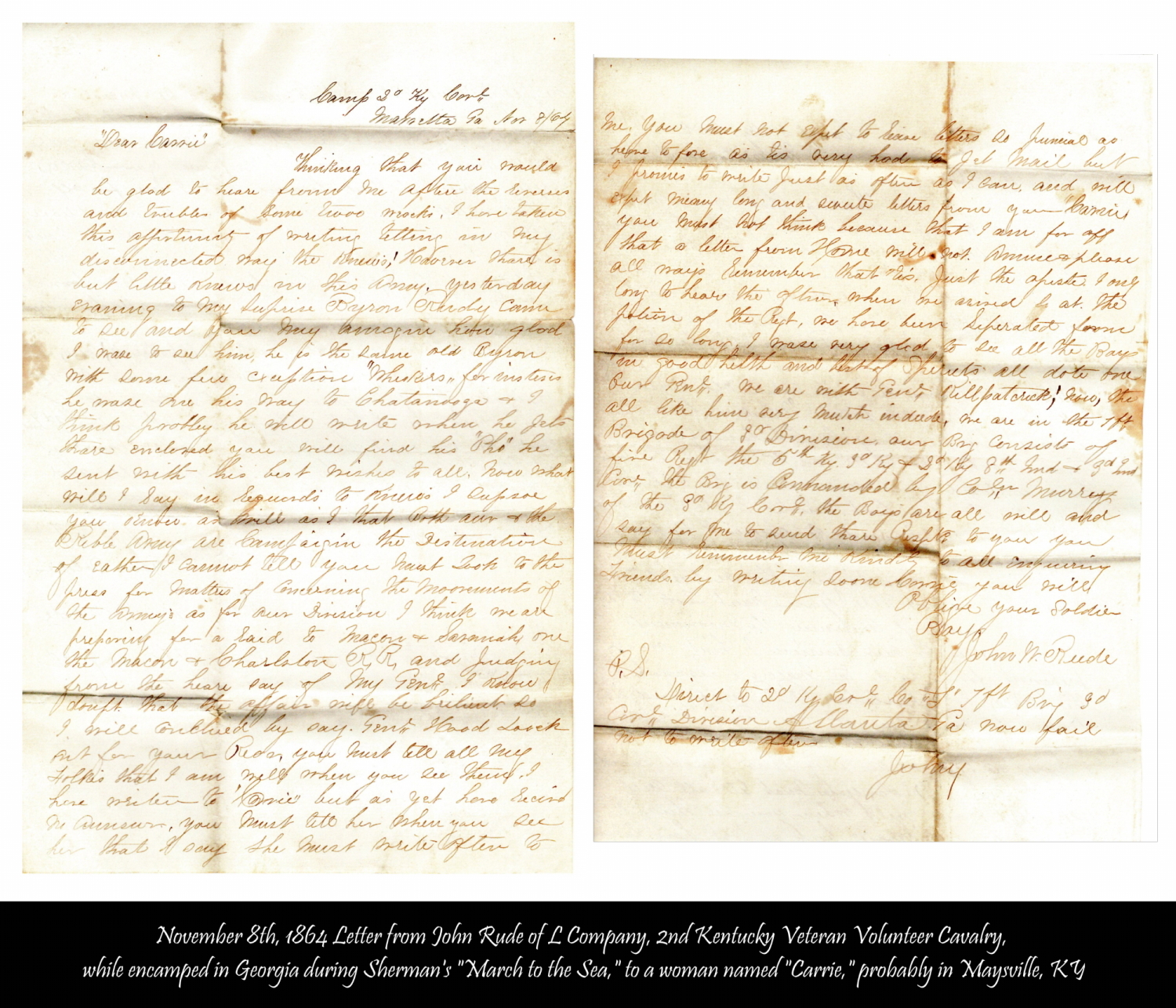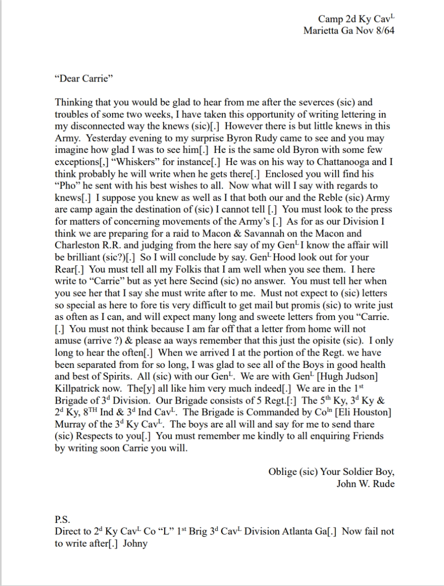 Probably good with horses, it may be that at some point this John Rute’s status informally changed. The 2nd Kentucky Cavalry described by the soldier that wrote the letter was clearly not the initial representation of the unit. There actually appear to have been at least three regiments by this name. The one indicated by the writer, led by General Hugh Judson Kilpatrick, was raised at Bridgeport, Alabama on February 7th, 1864, and was one of the veteran organizations that accompanied Sherman on his famous “March to the Sea.” It mustered out at Lexington, North Carolina, on July 17th, 1865.