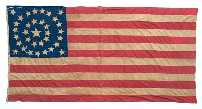 Kansas was admitted into the Union as the 34th state on January 29th, 1861, about 2 ½ months before the Confederate assault on Fort Sumter that marked the beginning of the Civil War. The 34th star was officially added on July 4th of that year, but most flag makers would have added a 34th star with the addition of Kansas in January. The star count remained official through the opening two years of the war, until July 3rd, 1863, and 34 star flags would have generally been produced until the addition of West Virginia in June of that year.
