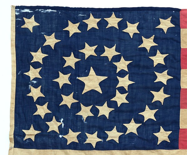 34 star American national flag, homemade and entirely hand-sewn, with a beautiful medallion configuration. The design consists of a large center star, surrounded by a wreath of 10 stars, set within an outer wreath of 19 stars, flanked by a star in each corner of the blue canton. This is a traditional medallion design, but note how the inner wreath was mistakenly placed too close to the hoist end and is thus offset from the outer wreath. The skewed placement provides a modernistic element and a strong dose of folk quality to the visual presentation.