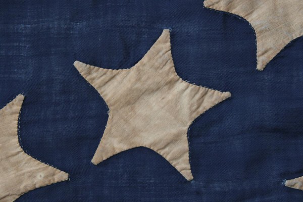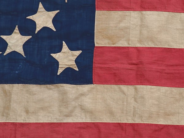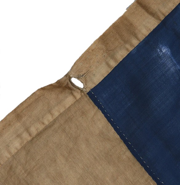 Approximately sixty to seventy percent of Civil War period flags had treadle, machine-sewn stripes. The fact that this example is entirely hand-sewn is a nice feature. The canton of the flag is made of wool bunting, while the stripes, stars, and binding are all made of lightweight cotton. While a poor fabric for flag-making, because it absorbs water, cotton was nonetheless the fabric of choice for most homemade flags, such as this one, because it was both lightweight and inexpensive. During this era, the makers of homemade cotton flags often substitute another type of fabric for the canton, apparently because solid blue cotton became extremely scarce with the onset of war and the demand for blue fabric in the North. Usually this was merino wool or a blended wool fabric of similar weight. Because wool bunting was a commercial grade fabric, produced specifically for flags and banners and not suitable for clothing, is an uncommon find on homemade flag. By 1876, flags with cotton stripes typically had cotton cantons.