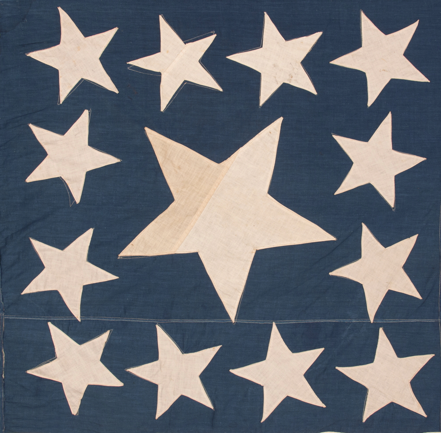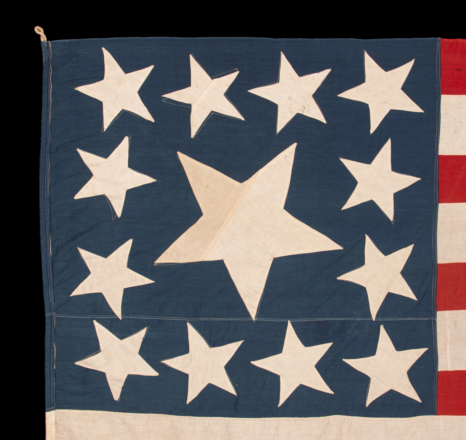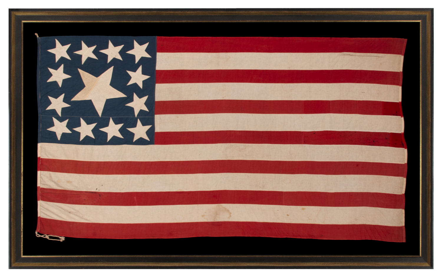| 13 STARS IN THE RARE AND VERY DESIRABLE TRUMBULL PATTERN, WITH AN UNUSUALLY ENORMOUS CENTER STAR, ON A HOMEMADE, ANTIQUE AMERICAN FLAG PRODUCED SOMETIME BETWEEN THE CIVIL WAR (1861-1865) & THE 1876 CENTENNIAL OF AMERICAN INDEPENDENCE; THIS STAR CONFIGURATION NAMED FOR ARTIST JOHN TRUMBULL, WHO BRIEFLY SERVED AS GEORGE WASHINGTON’S AIDE-DE-CAMP (1776), BEFORE TRAVELING TO BRITAIN TO TRAIN UNDER WORLD-RENOWNED AMERICAN PAINTER, BENJAMIN WEST, THEN RETURNING TO THE STATES, WHERE HE AFTERWARDS FEA |
