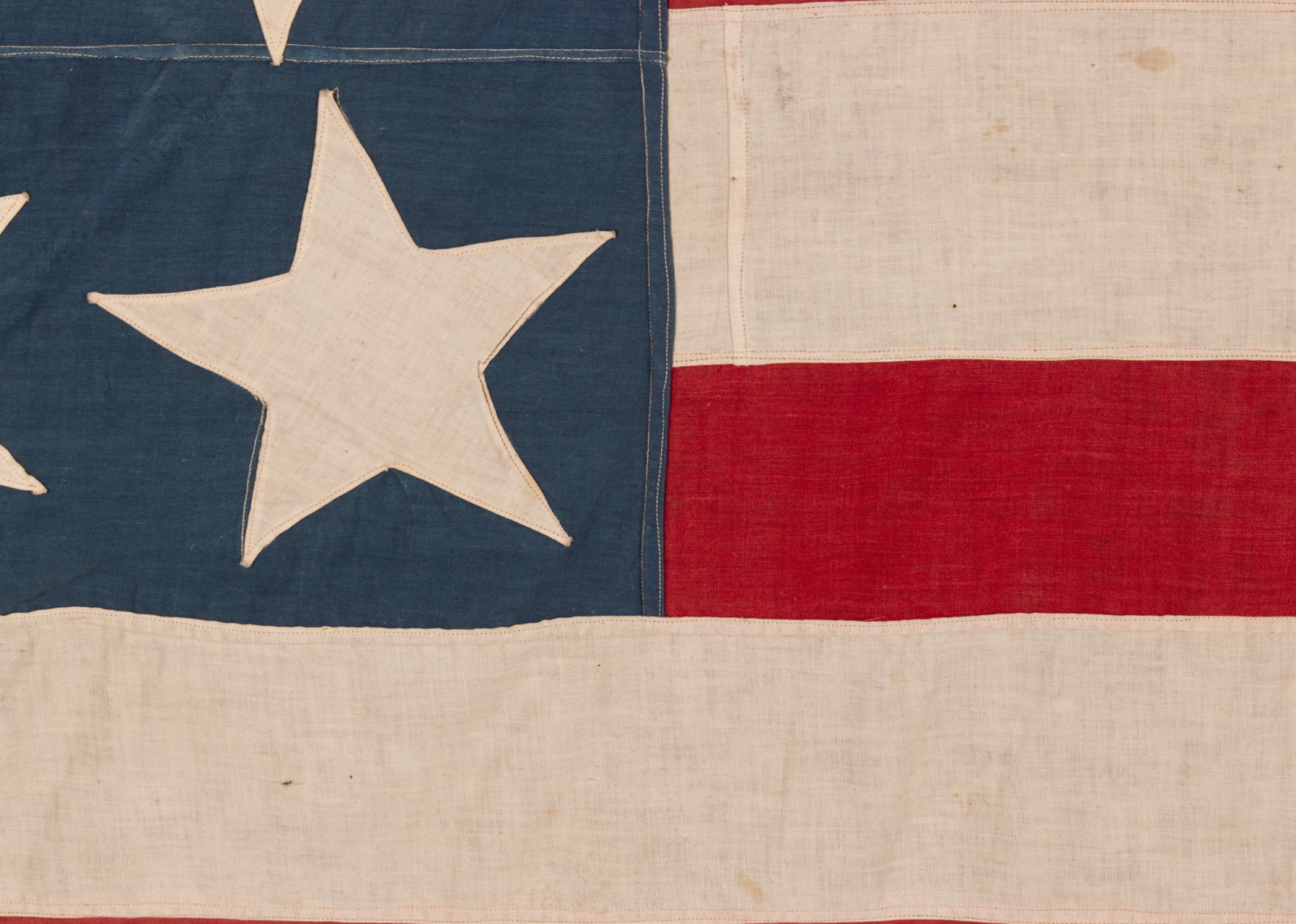 | Rare, homemade, American national flag, with what is known as the Trumbull configuration of 13 stars. This beautiful and very rare star arrangement is comprised of a single center star, contained within a square or rectangular perimeter of 12 stars. The design pays homage to the revolutionary war officer, John Trumbull (1746-1853), Harvard graduate and son of the Governor of Connecticut, joined the Colonial Army in 1775, where among other appointments, he served as George Washington's aide-de-camp, as well as within the staff of General Horatio Gates. Resigning in 1777, following a disagreement over the date of his military commission, Trumbull traveled to England to study art. There he was introduced by Benjamin Franklin to American painter Benjamin West, the most celebrated artist in the world at the time, now living abroad. While training under West, Trumbull was imprisoned for treason against the crown. This occurred when a scapegoat was sought, after a British officer, of similar military rank to Trumbull’s former appointment, was captured and hung in America. Six months later he was released to the States. After the war, Trumbull returned to England, where he was encouraged by West to paint significant American historical figures and American military scenes. He commenced doing so in 1785 and was especially prolific, producing more than 250 works within this genre. Trumbull included American flags with his former commander in several versions of his most notable views. In three of these he depicted a configuration of 13 stars that consisted of a single center star, set within a rectangular box of 12. These include: The Death of General Mercer at the Battle of Princeton In the collection of the Yale University Art Gallery, painted sometime between 1789 and 1831. Depicts the events of January 3rd, 1777. The Surrender of General Burgoyne at Saratoga, New York Installed in the United States Capitol Rotunda in 1821, painted in 1821. Depicts the events of October 17th, 1777. The Surrender of Lord Cornwallis at Yorktown, Virginia Installed in the United States Capitol Rotunda in 1820, painted between 1820 and 1821 (one of at least 4 versions illustrating 4 different flags). Depicts the events of October 19th, 1781. In his landmark book, Standards & Colors of the American Revolution, noted flag historian Edward Richardson describes Trumbull as "meticulous to the accuracy of uniforms and accoutrements; therefore, the flags depicted in [his] paintings should be considered as accurate versions of the time.” One extremely good argument against this assertation, is that the Battle of Princeton occurred more than 6 months before the First Flag Act was passed by Continental Congress, on June 14th, 1777. At that time, given present knowledge, the Stars & Stripes didn't exist. Though Washington may have displayed the Stars & Stripes, ground forces weren't formally authorized to carry it until well into the 19th century. The practice was not officially authorized until 1834 (artillery), 1841 (infantry), and 1862 (cavalry). Due to the above facts, and other supporting documentation—or lack thereof—some vexillologists have surmised that the American national flag was included by Trumbull, simply because the American public somehow expected it to be there, in a way not so very different from the modern perception today. One of several explanations for this phenomenon is that, with such inconsistency across both the flags of colonial regiments, and their uniforms, it was important to include some sort of common device that the viewer could identify as American. Whatever the case may be, the box medallion pattern in three of Trumbull's works led to a permanent association between this exceedingly scarce design with the Trumbull name. Whatever the case may be, his inclusion of the Stars & Stripes on the battlefield, be it fact or fiction, illustrates the appropriateness of its presence in the American consciousness from very early on. It could also be argued that Trumbull’s inclusion of the flag, prior to June 14th, 1777, may suggest that there is reason to speculate as to whether the 13-star, 13-stripe American flag was actually being displayed prior to that time. If so, it might explain why the language used in the legislation to make it official was so brief. Perhaps it was already familiar to those involved. Note the absolutely enormous size of the center star in this particular example, canted at a rakish angle and with most of the far smaller stars, about it, following suit. In addition to the great disparity between the scale of the center star, greater, proportionally, than just about any I have ever encountered, note also how the profile of the canton is relatively near-to-square square, unlike modern flags. All of the above features lend exceptional folk quality to the flag’s design. The flag was originally constructed entirely of plain weave cotton, though repairs, probably made in the era of its use, were completed with scraps of twill woven blanket wool. Though cotton was a poor fabric for flags made for long-term outdoor use, as it absorbed water, became heavy, and was thus subject to tearing and rot, it was nonetheless the fabric of choice for homemade flags. Unlike wool bunting, an open weave fabric used exclusively for the commercial manufacture of flags and banners, and silk, expensive and delicate, cotton was, in general, both reasonably priced and widely available. The stars of the flag are double-appliqued (applied to both sides) with a lineal, treadle stitch. The striped field was pieced and joined by treadle stitching, then hemmed to the canton by the same method. The body of the flag was rolled over along the hoist, to create an open sleeve, which contains a length of braided rope, looped at the top and knotted at the bottom, stitched firmly into place. The construction, star pattern, and fabrics employed, including those in its repairs, together suggest that it was m