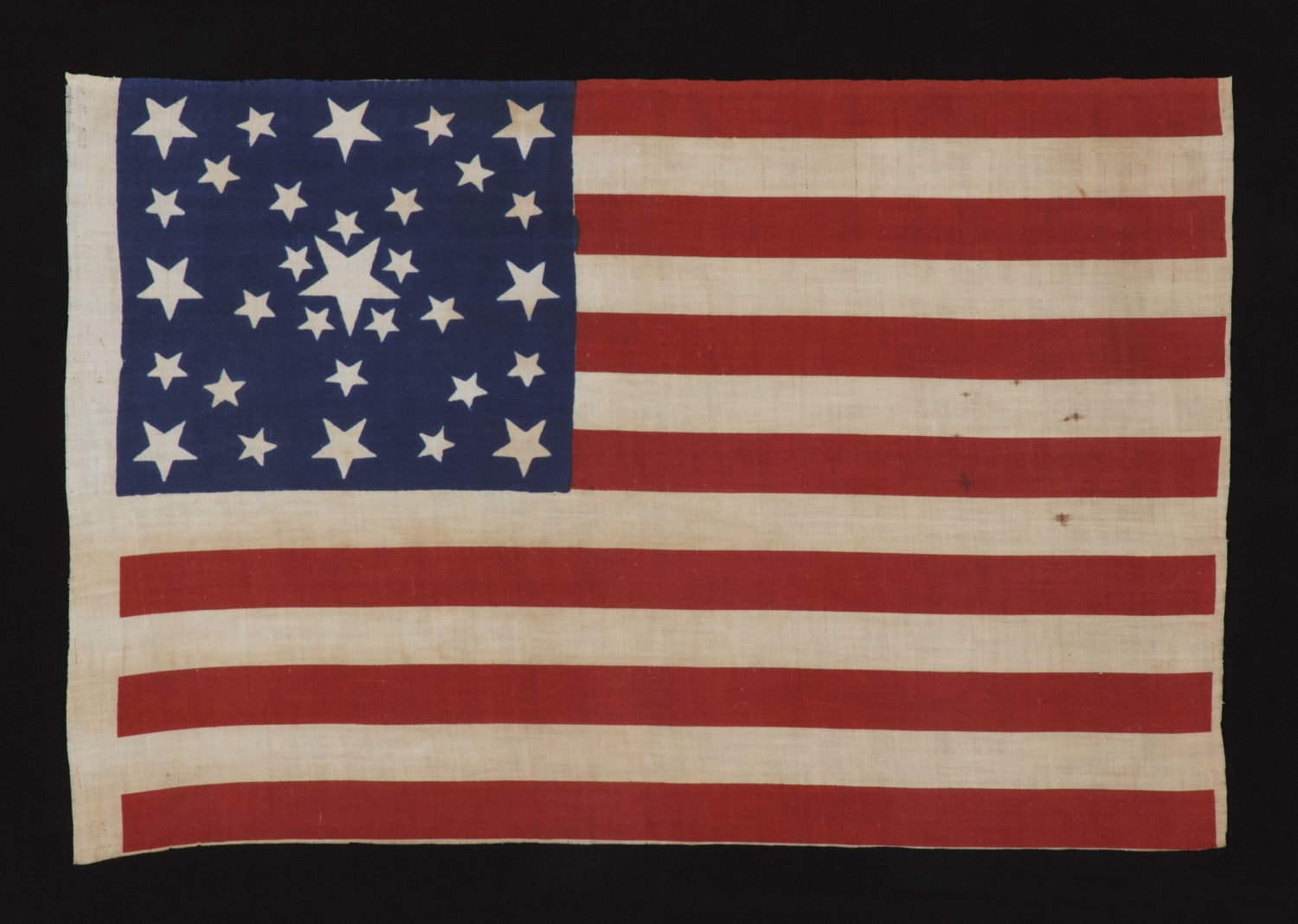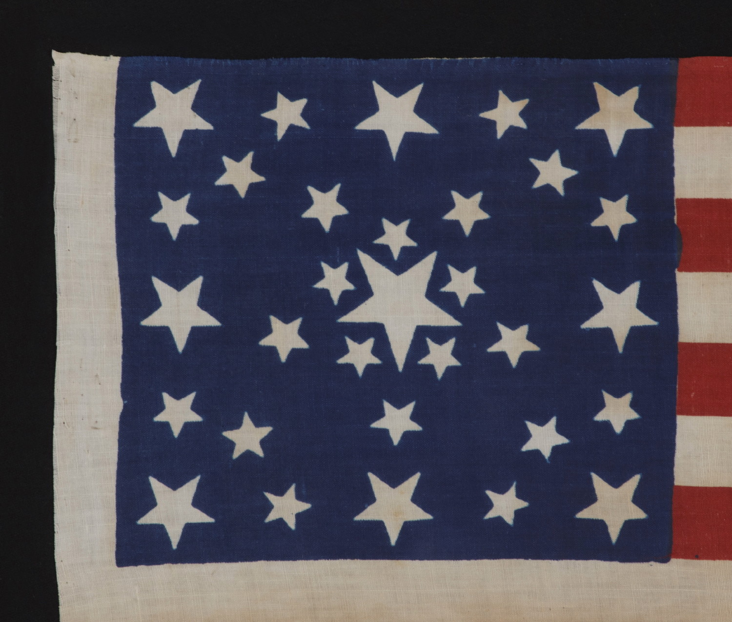 | 31 STARS IN A FANCIFUL STARBURST OR "GREAT STAR-IN-A-SQUARE", ONE OF THE MOST RARE AND INTERESTING CONFIGURATIONS THAT A COLLECTOR CAN ENCOUNTER, ON A PRE-CIVIL WAR PARADE FLAG, CALIFORNIA STATEHOOD, 1850-1858 |