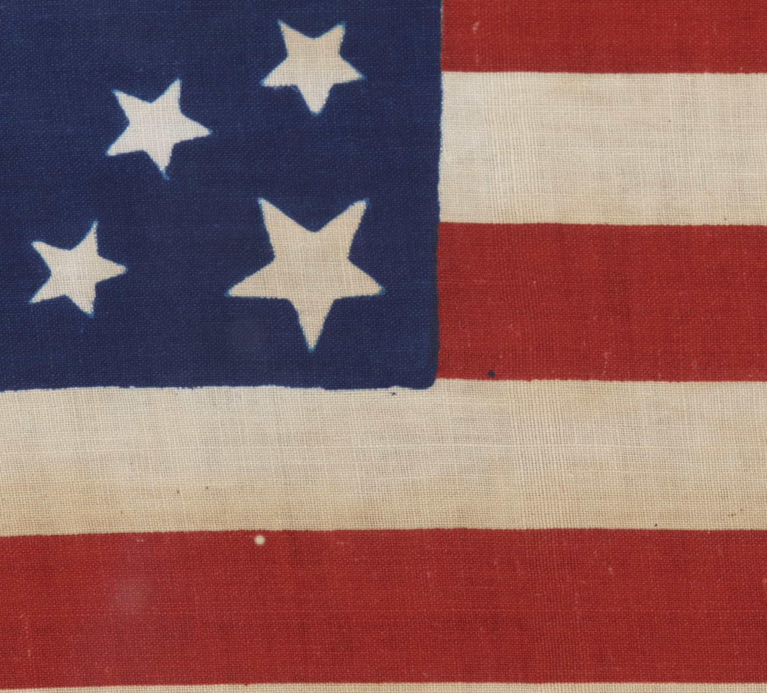 | In the world of antique American flags there are nearly countless star patterns, but most have lineal rows or columns. Some have circular designs, which are further down the rarity scale. The Great Star is much more scarce and highly coveted, and can be among the very best visually, but there are rarer configurations still. Among these are circles within squares, pentagons, ovals, and completely random patterns. There are flags where the stars actually spell something with alphabetic or numeric characters, some of which are among the rarest of all, but with regard to geometric configurations, the rarest--and arguably the most beautiful--are diamonds, shields, snowflakes, and starbursts (with occasional, unique exceptions). From a folk art perspective, these can excel beyond all others. Bold and whimsical, this American national parade flag, printed on cotton, has 31 stars arranged in a configuration that falls among the best that one may ever encounter on a 19th century example. This fanciful design can perhaps be placed into the general category of what I have termed "starbursts", meaning that there is dynamic pattern that seems to spring forth from the center, in a manner similar to the explosion of a firework. This particular starburst features what is called the "Great Star" or "Great Luminary" configuration (a large star made out of smaller stars) in the center. Great Star patterns vary widely in how they are assembled. In this case, the pattern is comprised of a large center star, with 5 small stars placed about it, one between each arm, so that they form a pentagon. Beyond these are 5 slightly larger stars, arranged so that they complete the star-shaped profile. 9 large stars, slightly smaller than the one in the center, are equally distributed about the perimeter and to form a rectangle. Arches of 3 smaller stars flank each corner towards the interior, connecting the spaces between the points of the larger stars. Because the Great Star pattern does not connect with the stars outside it, one could certainly argue that a more precise term for the configuration might be a "Great Star-in-a-square" with bracketed corners. But the inner stars do connect with the outer ones in various distinct ways. Note the prominent, narrow "V" shape, for example, that forks upward from the large star in the bottom center. Note also how the large center star, plus the Great Star arrangement itself, plus the 9 large stars around the perimeter, all appear upside-down with respect to how we typically expect to see a five-pointed star today, with two points up instead of one. No one knows if this orientation had any purpose. It is entirely possible that the designer did not feel that any particular position was “right-side-up”, but whatever the case may be, the circumstance is more interesting to collectors and the resulting graphics are more unusual to the eye. For these reasons, as well as the overall appearance, which seems to explode like a firework, classification among other known starbursts seems logical. In addition to being extraordinary from a visual perspective, this 31 star parade flag variety is very rare. Presently there are only two known examples in this exact form. A third flag is also known in the same size (presumably) and with the same star configuration, but with a political campaign overprint for the 1860 presidential run of Abraham Lincoln & Hannibal Hamlin. The flag was later sewn to an apron and evidently worn at a Harrison and Morton parade or rally in 1888. That textile is illustrated in “Stars and Stripes: Patriotic Motifs in American Folk Art” by Deborah Harding (2002, Rizzoli, NY), p. 56. California became the 31st state in 1850, ushered in on the heels of the 1849 Gold Rush. The 31 star flag became official on July 4th, 1851, and remained so until July 3rd of 1858. Flags made prior to the Civil War are extremely rare, comprising less than one percent of 19th century flags that exist in the 21st century. Prior to the Confederate attack on Fort Sumter in 1861, the Stars & Stripes was simply not used for most of the same purposes we employ it in today. Private individuals did not typically display the flag in their yards and on their porches. Parade flags didn't often fly from carriages and horses. Places of business rarely hung flags in their windows. Even the military did not use the national flag in a manner that most people might think. Most people are surprised to learn that the infantry wasn’t authorized to carry the Stars & Stripes until the 1830’s, and even then did not often exercise the right, because it was neither required nor customary. The primary purpose before the Mexican War (1846-48) was to mark ships on the open seas. While the flag was used to mark garrisons and government buildings, the flags of ground troops were often limited to the flag of their own regiment and a federal standard. Political campaigns seem to have fueled most of the use of printed parade flags, such as this one, prior to the Civil War. This was a major turning point and private use rose swiftly with wartime patriotism, then exploded in 1876 with the celebration of our nation's 100-year anniversary of independence from Great Britain. Mounting: The gilded American molding dates to the period between 1840 and 1860. The flag has been hand-stitched to 100% cotton, black in color, which was washed to reduce excess dye. An acid-free agent was added to the wash to further set the dye and the fabric was heat-treated for the same purpose. Spacers keep the textile away from the glazing, which is U.V. protective glass. Condition: There is minor oxidation throughout, accompanied by some small stains in the 2nd, 6th, 7th, and 8th stripes near the fly end. The flag presents beautifully and is exceptional for the period. Many of my clients prefer early flags to show their age and history of use. |