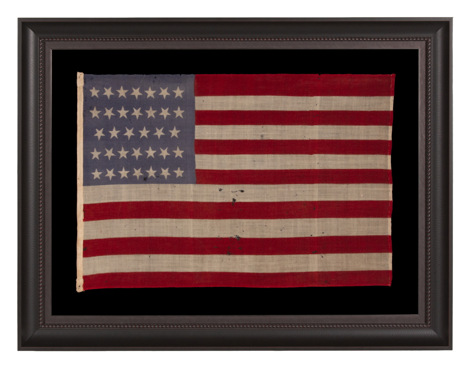 Kansas was admitted into the Union as the 34th state on January 29th, 1861, about 2 ½ months before the Confederate assault on Fort Sumter that marked the beginning of the Civil War. The 34th star was officially added on July 4th of that year, but most flag makers would have added a 34th star at the time of Kansas’ arrival, if not even before that day—a practice that became common during the latter 19th century. This star count remained official until July 4th, 1863, and 34 star flags would have generally been produced until the addition of West Virginia in June of that year, 11 days before the Battle of Gettysburg.