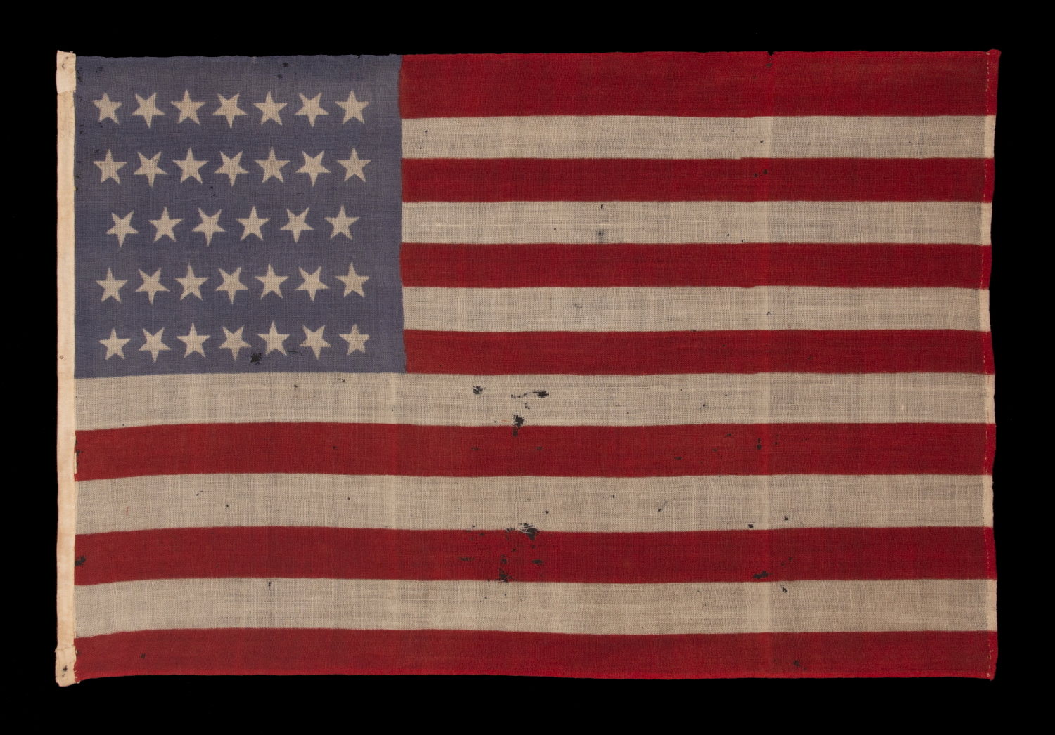 34 star American national flag, press-dyed on wool bunting, with wonderful colors and interesting visual features. Note how the stars, which are arranged in linear rows of 7-7-6-7-7, are oriented consecutively point-up, point down in their vertical alignment across the canton, resulting in what I call “tumbling” or “dancing” formation. Also note how the canton, which falls somewhere between periwinkle blue and indigo, contrasts beautifully with the scarlet red of the stripes.