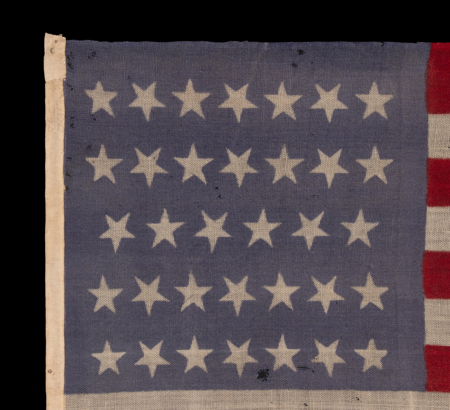 Condition: There are two small areas of modest mothing and there is minor mothing elsewhere. There is moderate fading of the blue canton. There are two repairs along the hoist binding, at the top and bottom, where additional fabric was added for strength. Along the original part of the binding are light, penciled markings, now illegible. Many of my clients prefer early flags to show their age and history of use. |