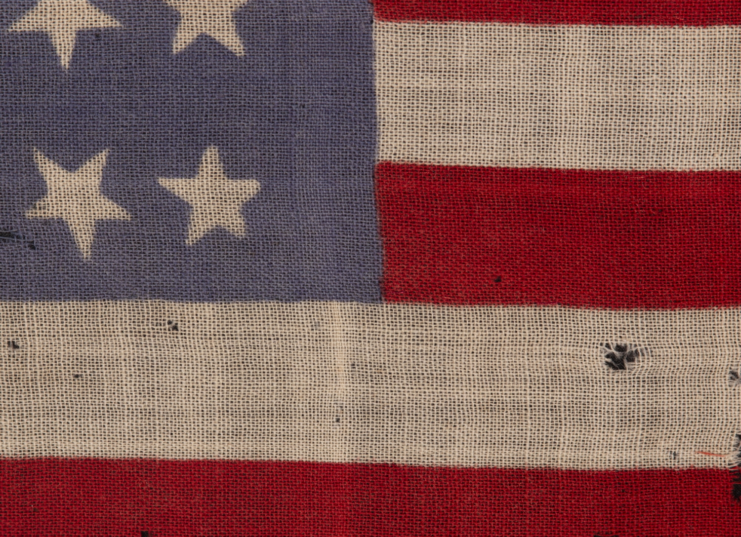 A form of resist-dyeing, this method often resulted in crude characteristics, such as stripes with irregular lines, in various widths, and stars with inconsistent shapes, in slightly varying sizes. It is likely that this resulted in some lost product and wasted time, from flags that had bleeding or misprint issues and were of too poor quality to sell. Within those flags that survived, today’s collectors today find the irregularities interesting, not only because they demonstrate early production methods, but also because they lend the sort of folk qualities that make early flags more interesting to look at.